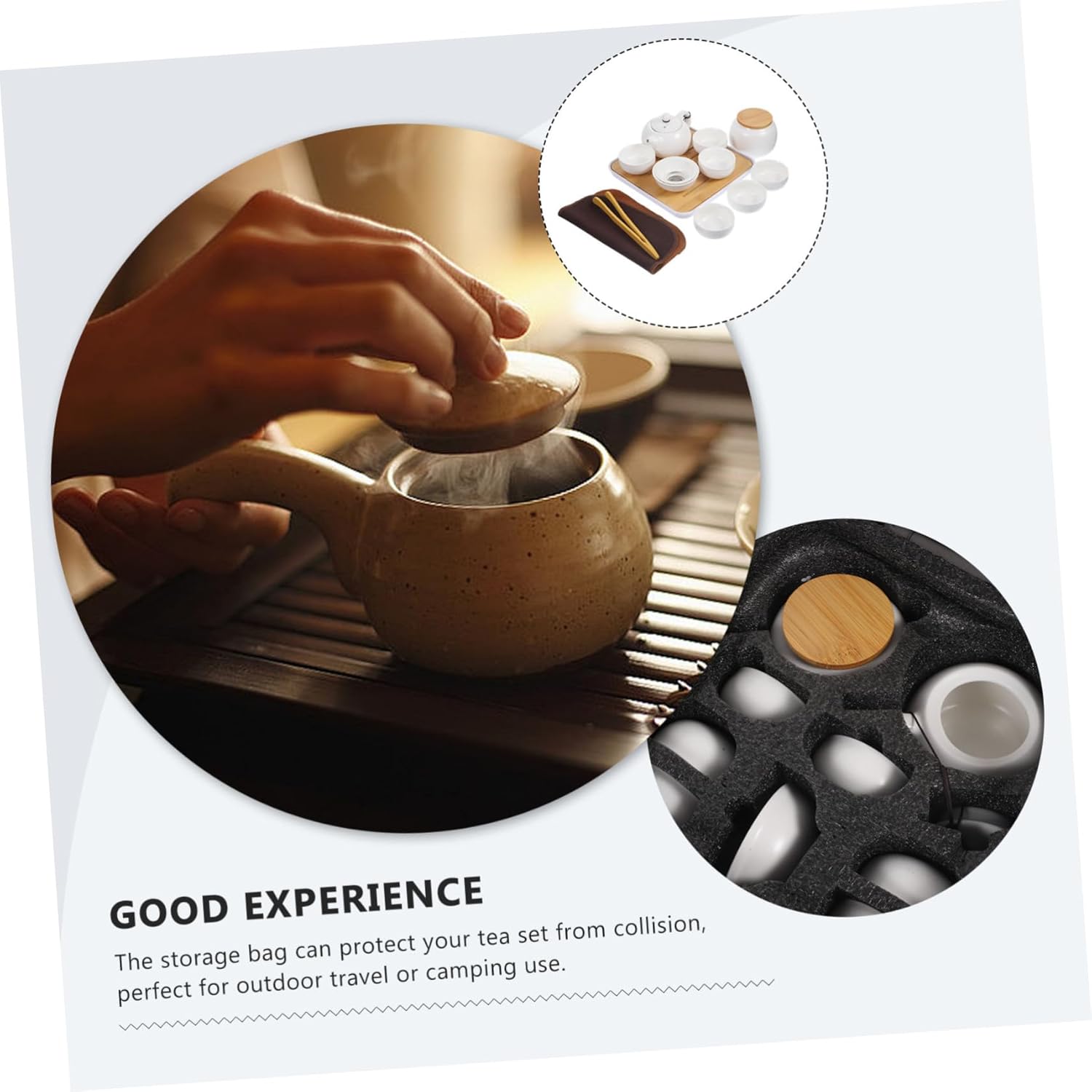 This easy to carry tea set with storage bag is travel, camping, hiking and other occasions. The teapot and teacups are made from materials, are and . This practical and portable tea set is the for a family member or friend who enjoys drinking tea.