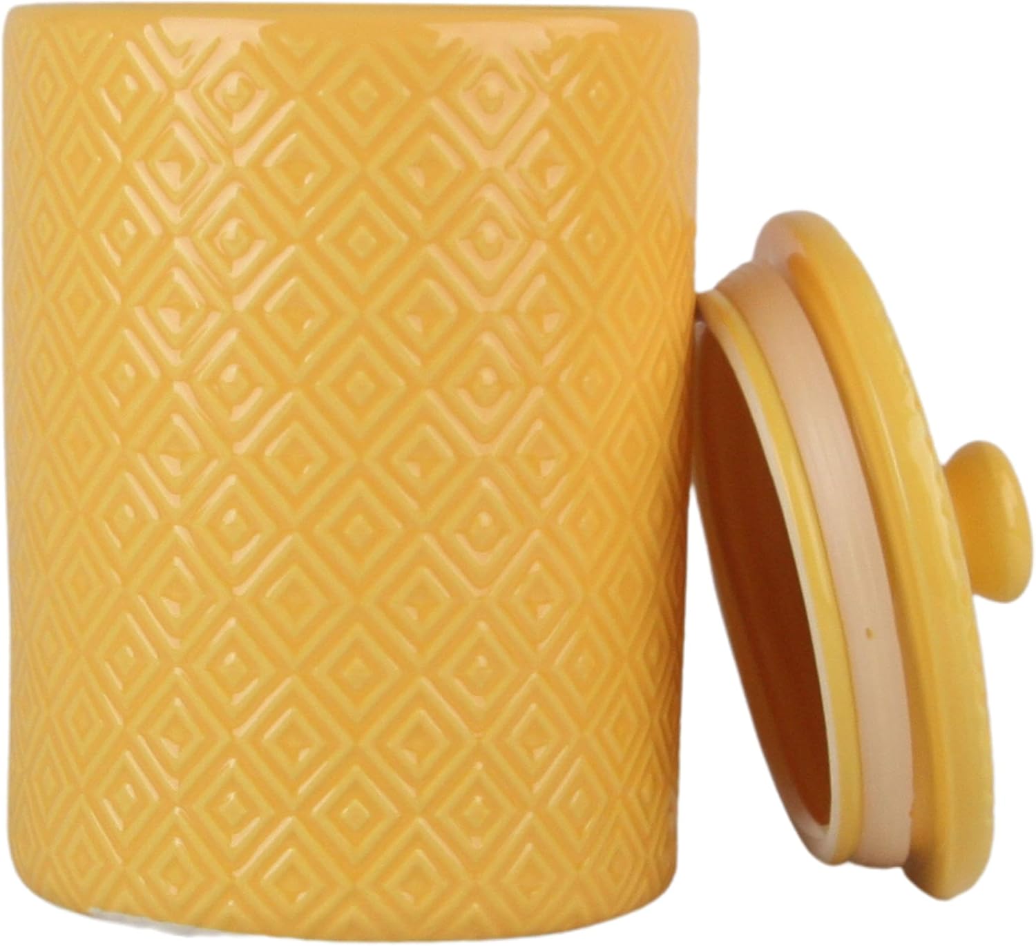 This posh set of 3 ceramic canisters are embossed with a diamond texture, and feature knobbed lids. Perfect for storing your countertop staples like flour, sugar, coffee or tea, while adding a stylish touch of décor to your kitchen! Set includes 1 x 24 oz small canister 3.75”L x 3.75”W x 5.5”H; 1 x 38 oz medium canister 4.5”L x 4.5”W x 6.25”H; 1 x 72 oz large canister 5.5”L x 5.5”W x 7.5”H.