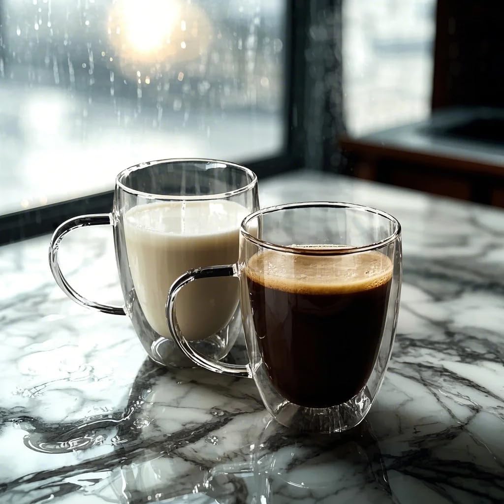 HANDCRAFTED, EASY TO CLEAN, AND DURABLE: Double-walled glass coffee mugs add a touch of luxury to your kitchen or dining table. They are more heat-resistant, highly transparent, thinner, lightweight, and modern—combining functionality with a minimalist design—yet sturdier than regular glass. They are dishwasher- and microwave-safe, but hand washing is recommended.