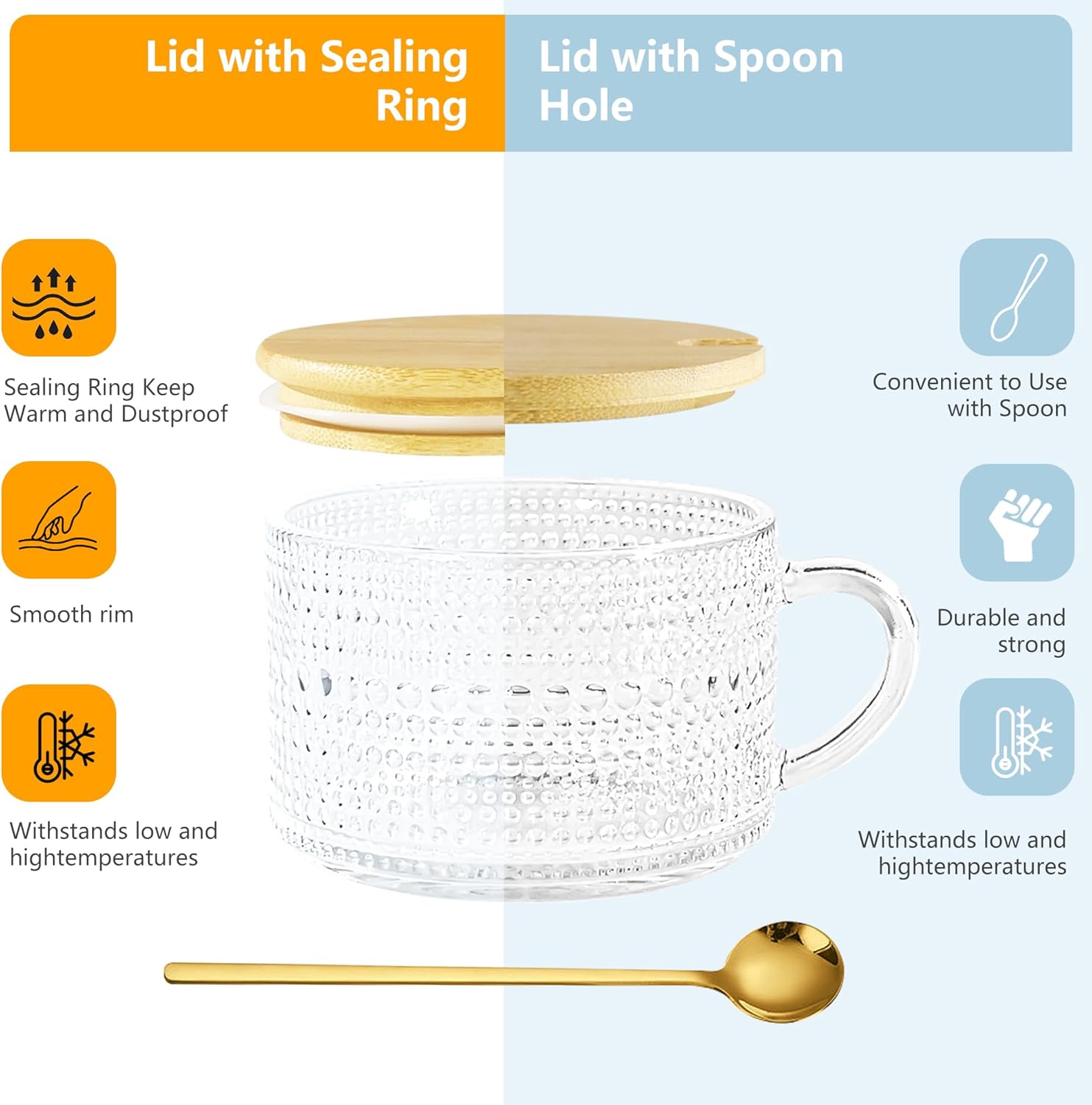Product Configuration: The glassware sets include: 14oz glass hobnail mugs*6, bamboo lids with sealing ring *6, metal spoon*6. The size of these drinking glasses is 2.95” W x 3.95” H. These coffee cups are made of premium quality glass, which is more durable, stronger and scratch-resistance than normal glasses. With a thickening sturdy construction, these coffee mugs can be safely used in daily life.