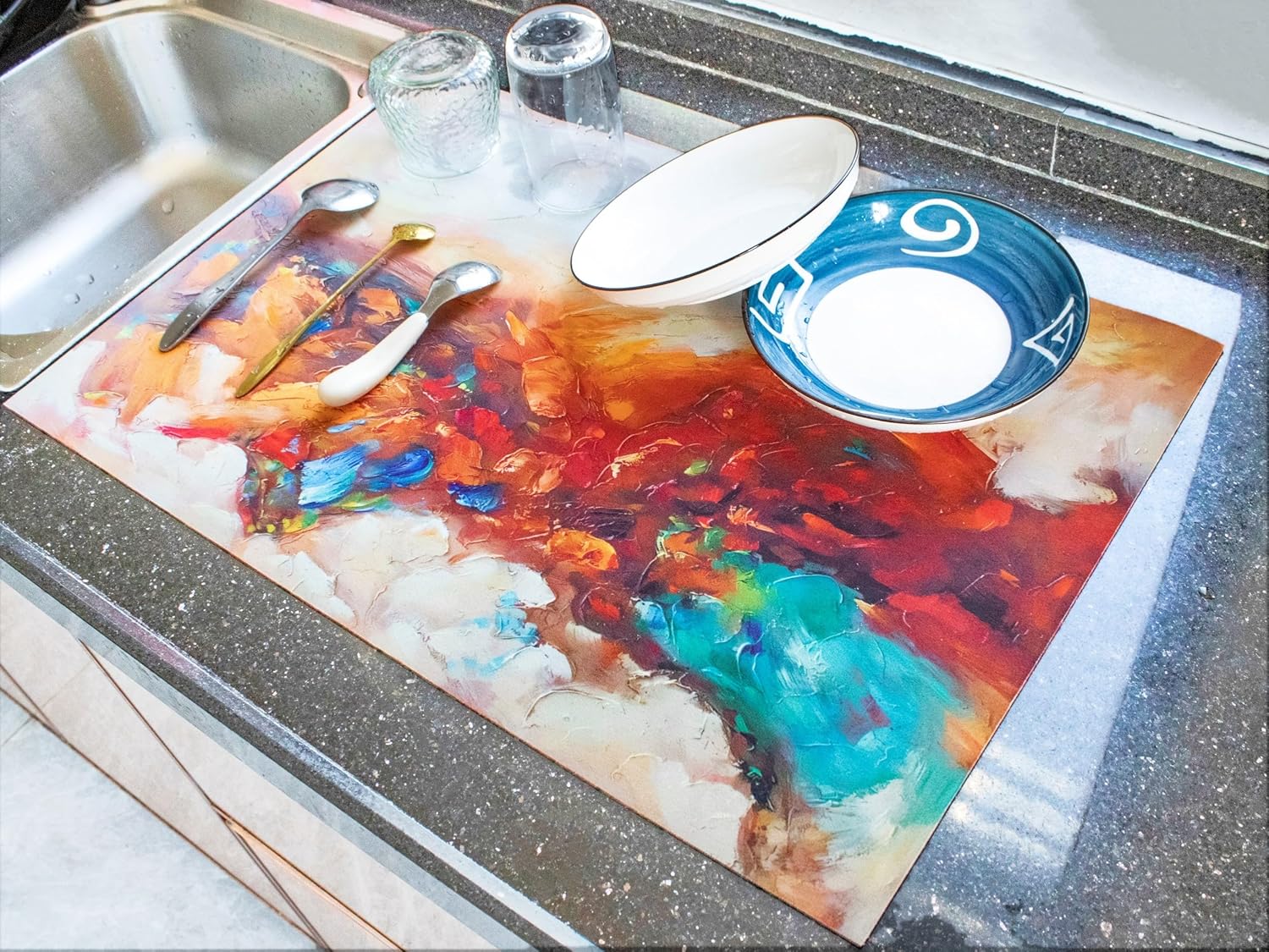 This drying mat is amazing! Because of the shading it looks like it is textured like an oil painting would be. When you touch it it is smooth. I looks lovely on the quartz countertops and best of all protects them. I didn’t, but there is the option to trim it as needed which is a plus. It is a nice thickness and the backing keeps it in place. For both beauty and function it is a great addition to the kitchen!