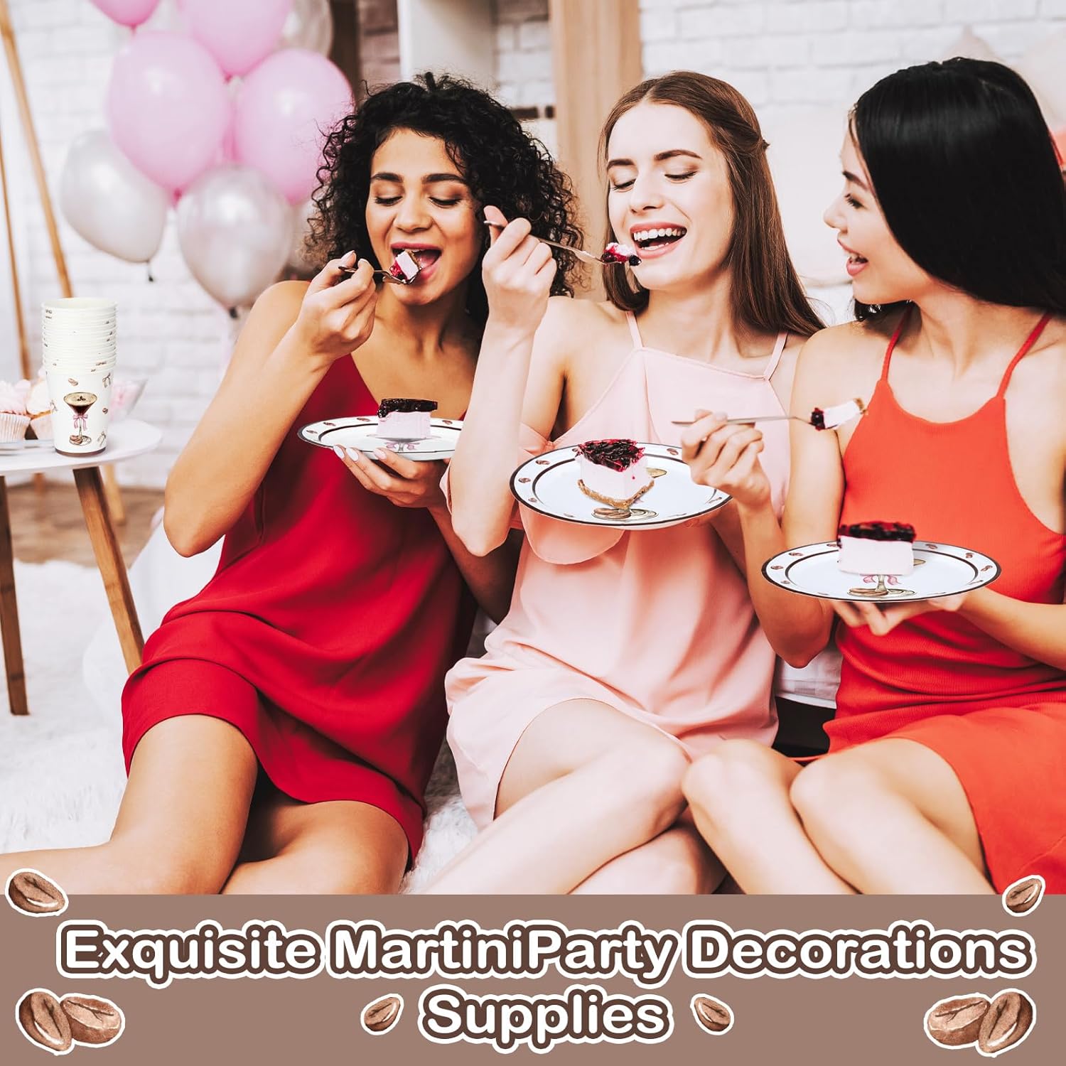 Espresso Martini Party Supplies: the martini birthday party decorations package comes with 24 sets of decorative dinner plates, napkins, disposable cups, knives, forks, and spoons, a total of 168 pieces; The diversity in size of the products offers more convenience; Large dinner plate measures 9” while the small one is 7”; The napkin folded measures 6.4”, paper cup is 3.5”, knife is 7”, and spork is 6 inches