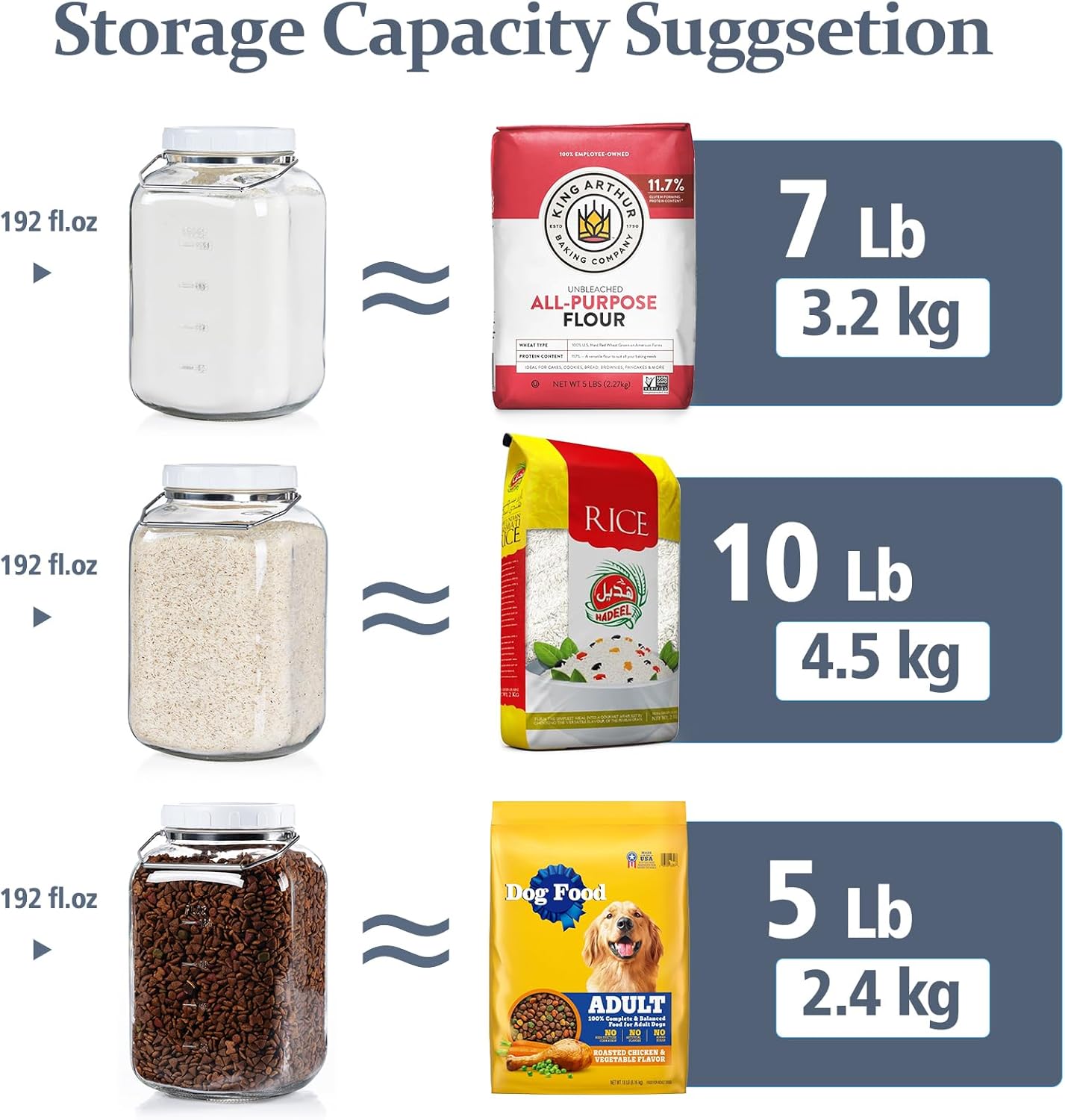 Oh my gosh, I absolutely love these. I did not know they made a 1 & 1/2 gallon size storage jar. So not only did I buy these 1 & 1/2 gallon but I also bought the 2 gallons so glad I did. I wish they had a 1 gallon from the same company because I love these handles,, but I could not find one.I absolutely love the metal handle and it has the good silicone Ring inserts that stay where they are supposed to with the little tab to pull them out. They seem to be very heavy duty. They came in a Styrofoam insert inside of a box so very well packaged no chips or breaks as a matter of fact, the Amazon guy happened to drop one when he was putting it down and I was concerned that it may have broke, but everything was good.I honestly canât say enough nice things about these jars. I am just so impressed. I am so tired of all the plastic containers, causing my dry food to taste funny my older plastic containers that were made 20-30 years ago never did that so I am hoping that by using glass containers and taking food out of their original packaging will help alleviate this situation. I know that even my boxed food often ends up tasting funny and I think it has a lot to do with the packaging or possibly how itâs been stored at the plants and stores. It just didnât used to be that way who knows what theyâre putting in our crap now a days.But my plan is to use the giant 2 gallon glass jars to put my long spaghetti noodles in and the over abundance of lasagna noodles that I accidentally bought. But they would be perfect for sugar and flour. The 1 & 1/2 gallon will be perfect for the other smaller noodles. Excellent for rice. Excellent for beans you can fit quite a bit in these They have a good airtight seal. I think that the food would stay fresh and having the handle on it would be easy to lug them around.I will probably mainly use all of the new glass jars that I have purchased for my noodles, beans and rice. They are super easy to clean. I was able to do a quick hand wash then throw them in the dishwasher except the 2 gallons jars were just a hair bit too tall so they couldnât go in the dishwasher. But the lids washed fine in the dishwasher no warping and the gaskets didnât fall out overall I highly recommend this product and will probably buy more again.