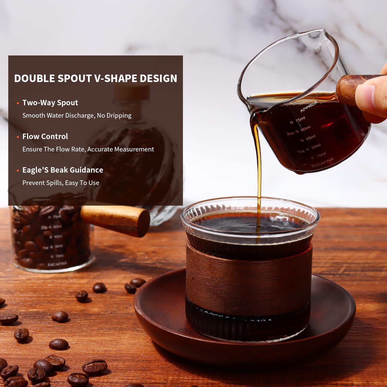 The two-way spout allows you to pour easily without turning. So the double spout glass measuring cup can pour smoothly without staining the tabletop and it is a good helper for your coffee.