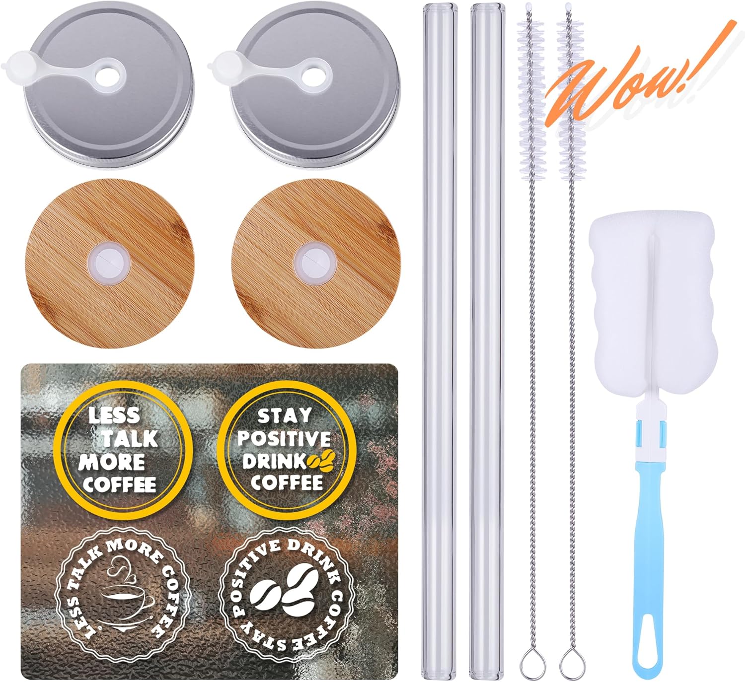 These 20 oz glass cups are perfect for iced coffee, smoothies, and other beverages. Their wide mouth makes them easy to drink from, and the straws are durable. The bamboo lid is eco-friendly, and the metal lid is leakproof, which is great for travel.Pros:â Durable glass with a wide mouth for effortless drinkingâ Two lid choices (bamboo & leakproof metal)â Comes with a cleaning kitâ Environmentally friendly and reusableâ Perfect size for most drinksCons:â No handleâ Glass is a bit heavier than expectedâ Straws can be difficult to clean in tight spotsGet em’!