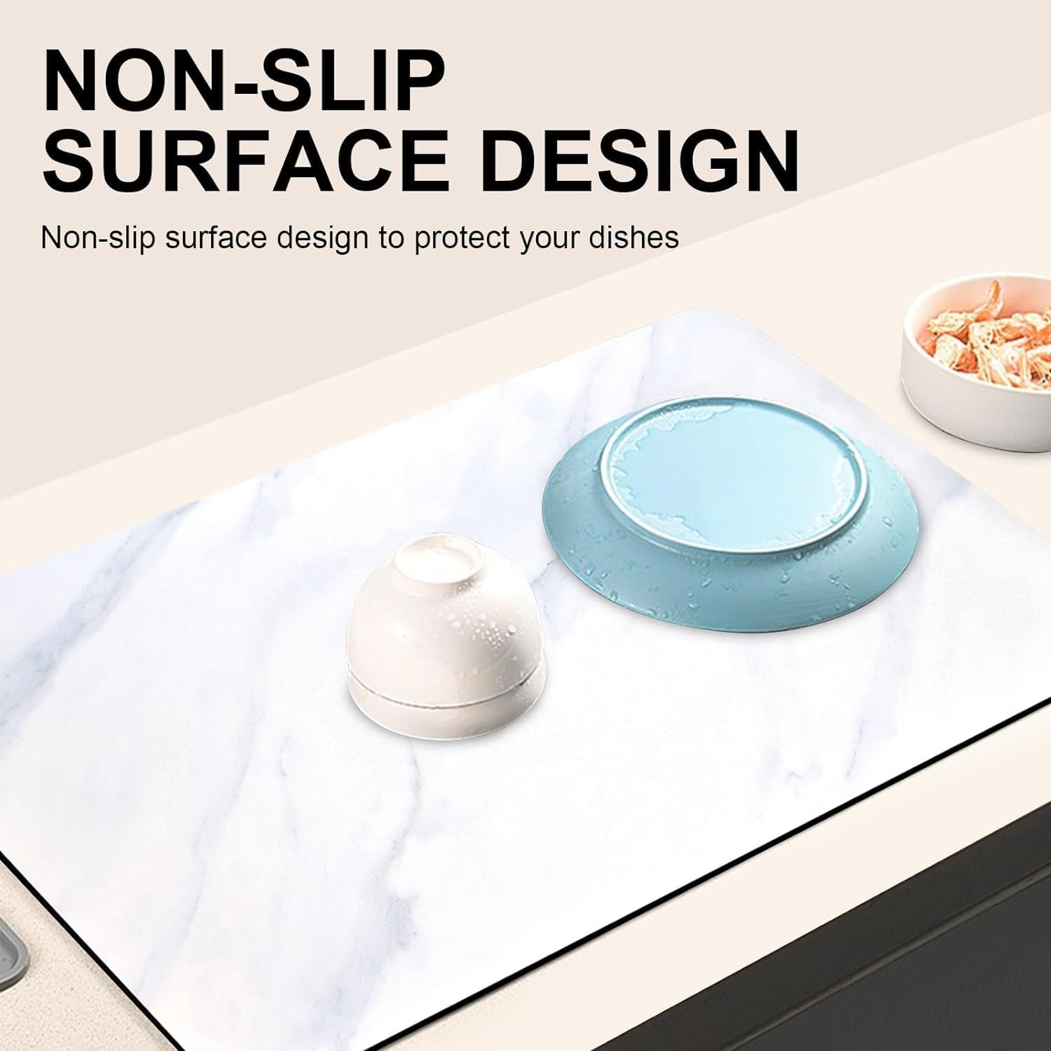 SUPER ABSORBENT & QUICK DRY: The dish rack mats are made of diatomaceous earth, breathing leather surface and natural rubber base; Diatomaceous earth can hold up to 150% of its weight in moisture and evaporates quickly, your dishes and kitchen countertops will keep dry all the day