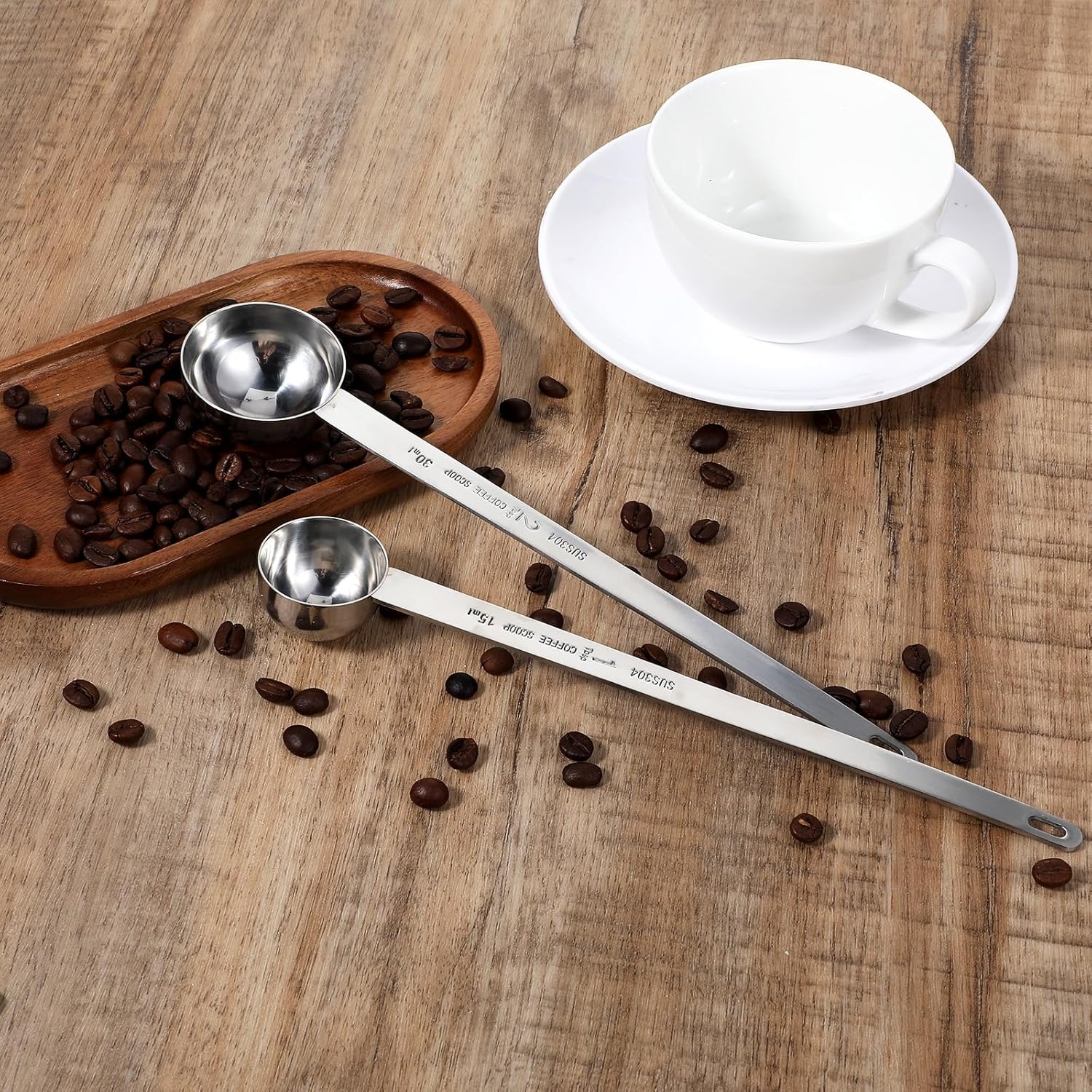 【Extra Long Handle】The package contains 2 measuring spoons,1 tablespoon&2 tablespoon,The length of this coffee scoop is 24.5 cm (9 inches), which can easily reach the depth of the coffee container, please pay attention to the size error before purchasing.