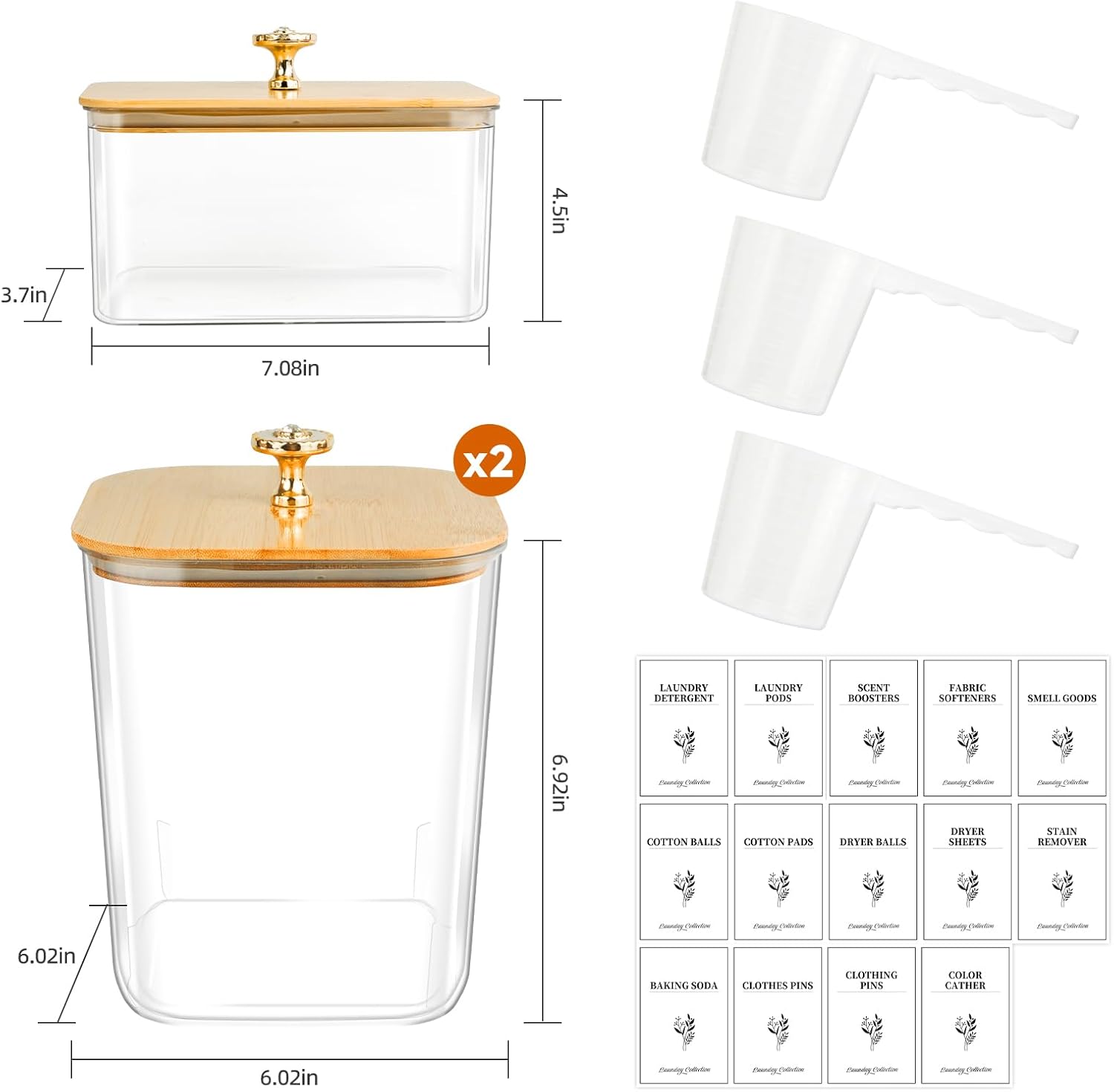 Package Include: Clear square container x 2 (capacity 3.8 L), square bamboo lid x 2, clear dryer sheet container x 1, rectangular bamboo lid*1, clear spoon*3 , PVC label x 27, drawer handle x 3, screwdriver x 1,screws x3.