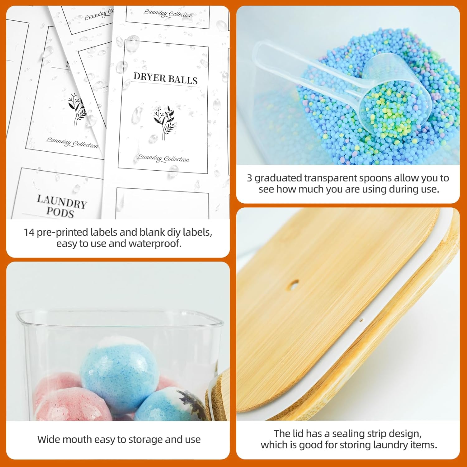 Laundry Containers: 2 large-capacity clear storage jars and a dryer sheet container. Comes with Common tabs and blank labels for easy organization of your laundry room. Lids and spoons can be better stored and used.