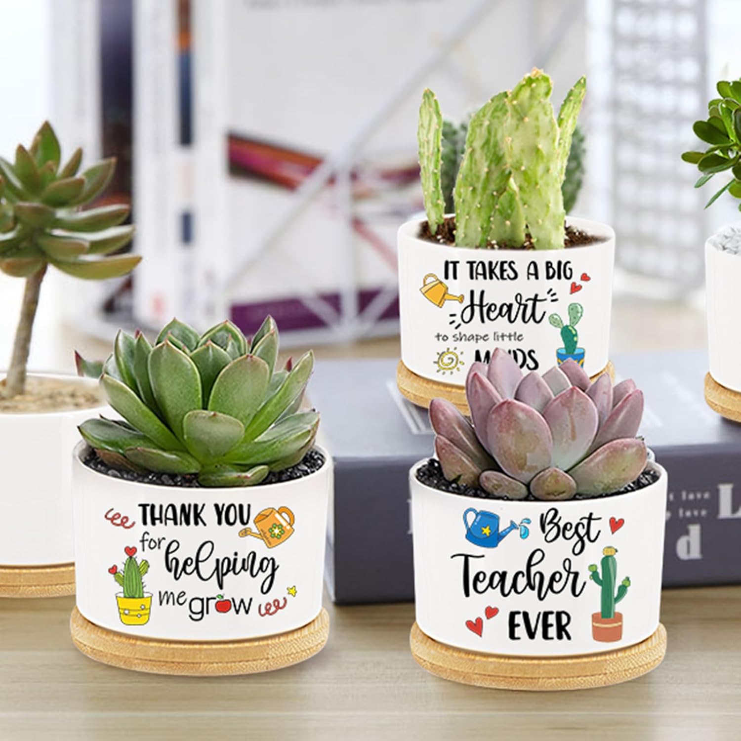 3Pcs Teacher Appreciation Gift Succulent Pots Mini Ceramic Plant Pot with Bamboo Tray Pots Planters for Best Teacher Thank You for Helping Me Grow for Graduation Birthday Plants Not Included