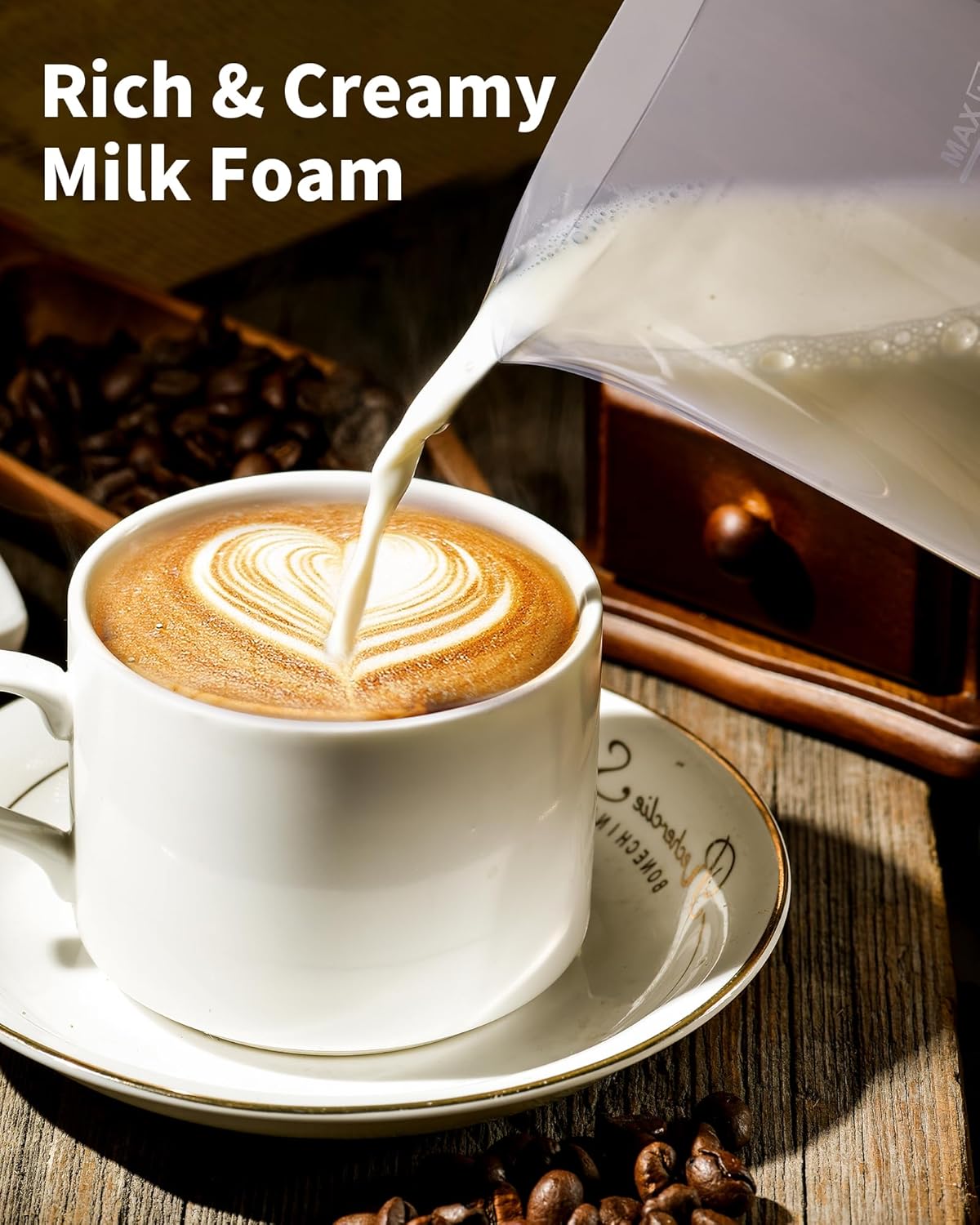 4-IN-1 Versatile: This milk frother and steamer can create hot dense foam, hot airy foam, cold foam, and hot milk. Heating milk temperature is 149°F±9°F. Max milk frothing capacity is 5.07oz/150ml, Max capacity for hot milk is 10.14oz/300ml perfect for personal or family use