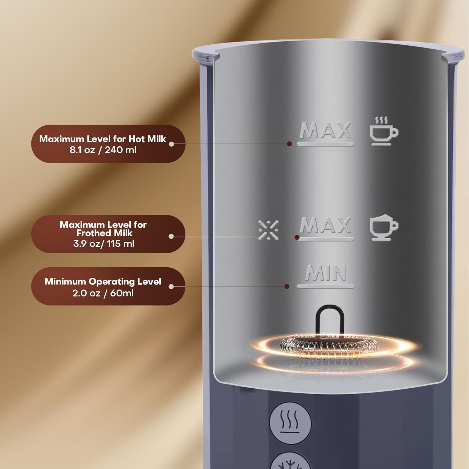 Small Size with Large Capacity: Add milk into the jug between MIN 60 ml / 2.0 oz and MAX 115 ml / 3.9 oz for frothing; And this milk warmer can also heat up 240 ml / 8.1 oz milk at maximum; With these great capacity of foam making and milk heating, it still operates quietly