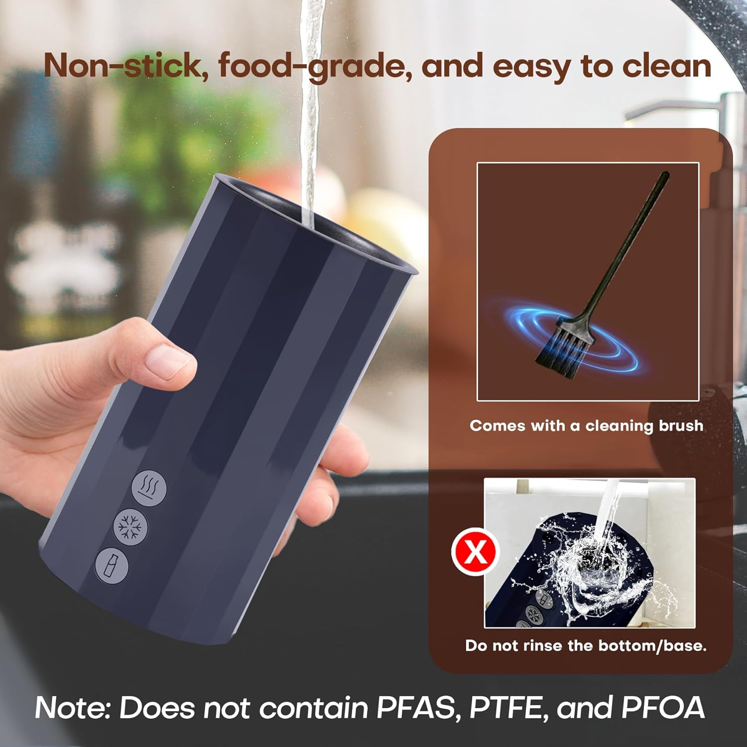 Easy to Use And Easy to Clean: With 3 button controls and 3 colors ambient light only, this foam maker provides clear instruction; Blue for cold foam, red for hot thick foam or milk heating, yellow for hot soft foam; Without of PFAS, PTFE and PFOA, Casimhu milk frother adds a non-stick coating, but easier to clean