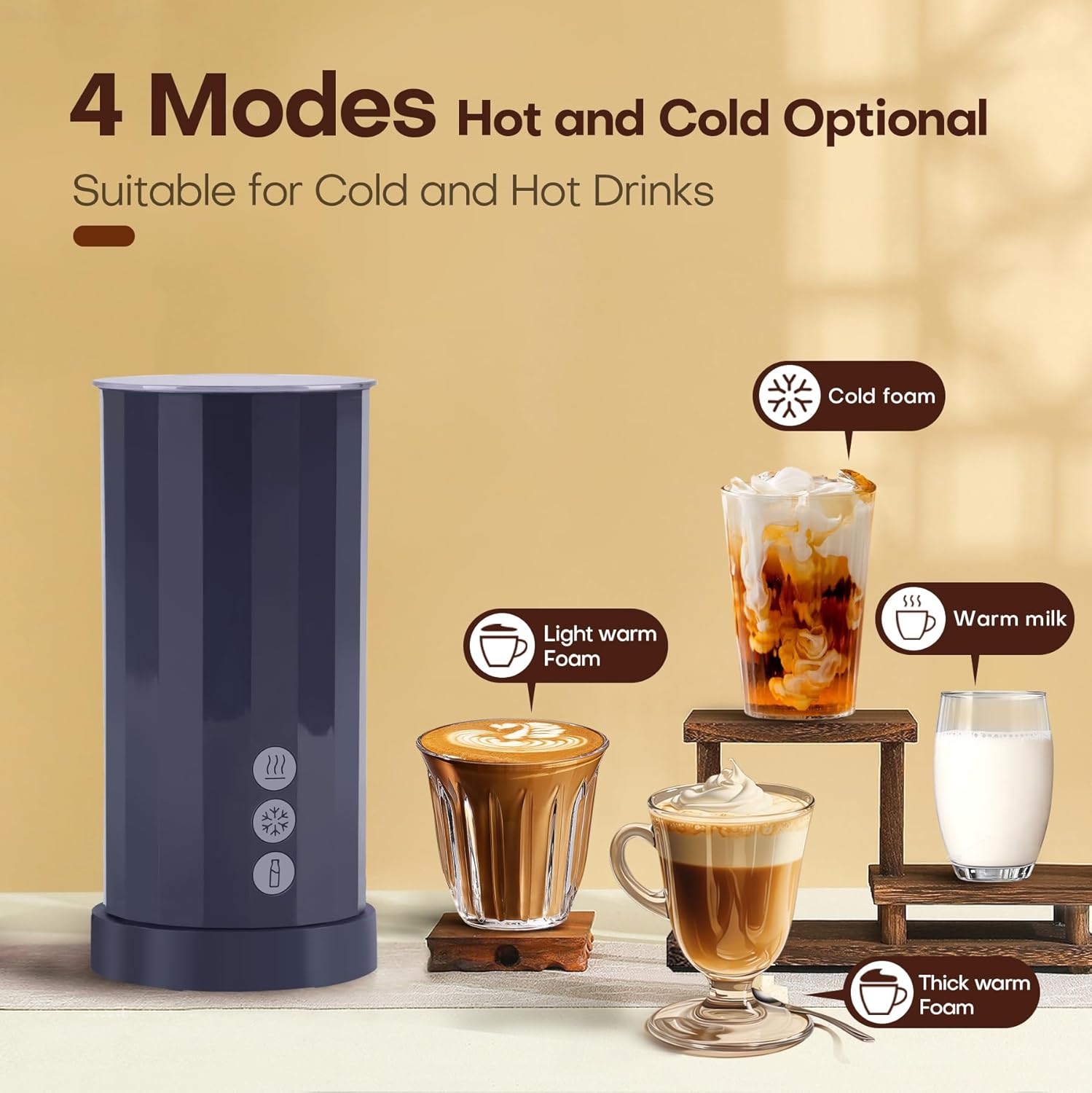 4-in-1 Multifunctional: With 4 modes optional, this milk frother enables you to get hot thick foam, hot soft foam and cold foam as you like and also heat up your milk