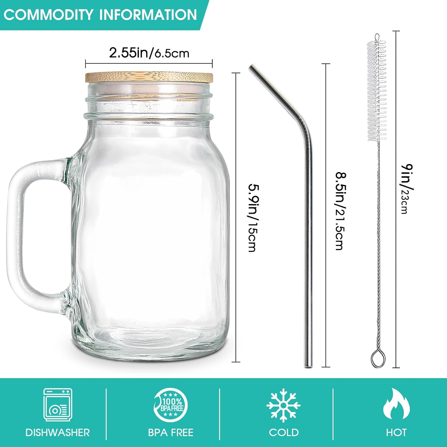 🍹SCIENTIFIC HANDLE DESIGN: This mason jar with handle has a capacity of 20 oz, which is large enough to hold more drinks or coffee. can cater to a small gathering.The large handle design that is in line with ergonomics is more convenient for you to sip.classic design make them a practical choice for everyday use.
