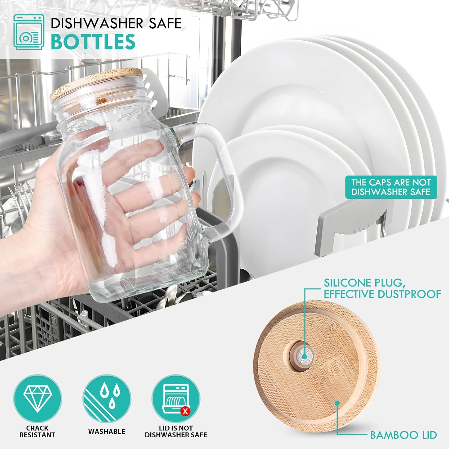 EXCELLENT QUALITY: The mason jar mugs with handles are made of Lead-Free food safe grade glass,High temperature resistant, The thickened glass bottle body is strong .