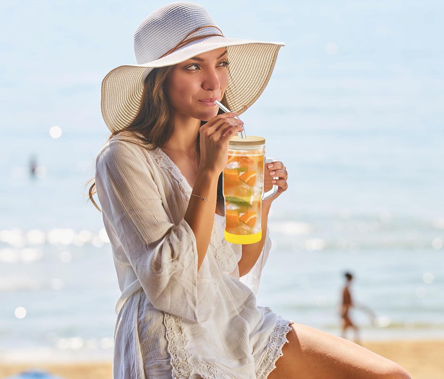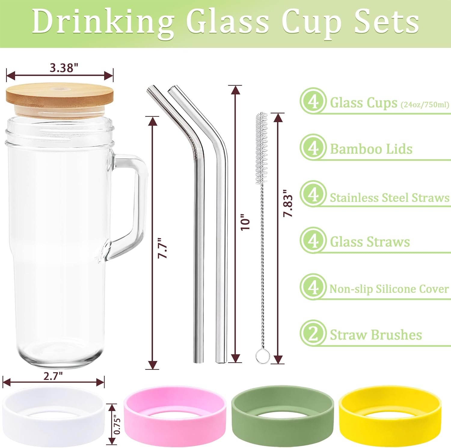 Versatile and Convenient Set: Get the perfect all-in-one set for your favorite drinks with 4 glass cups with handles (24oz/750ml), 4 bamboo lids, 4 stainless steel straws + 4 Glass straws, 2 straw brushes, 4-colour non-slip silicone cover. The ergonomic design of the mason jar cups with handles allows for comfortable grip and prevents slips.