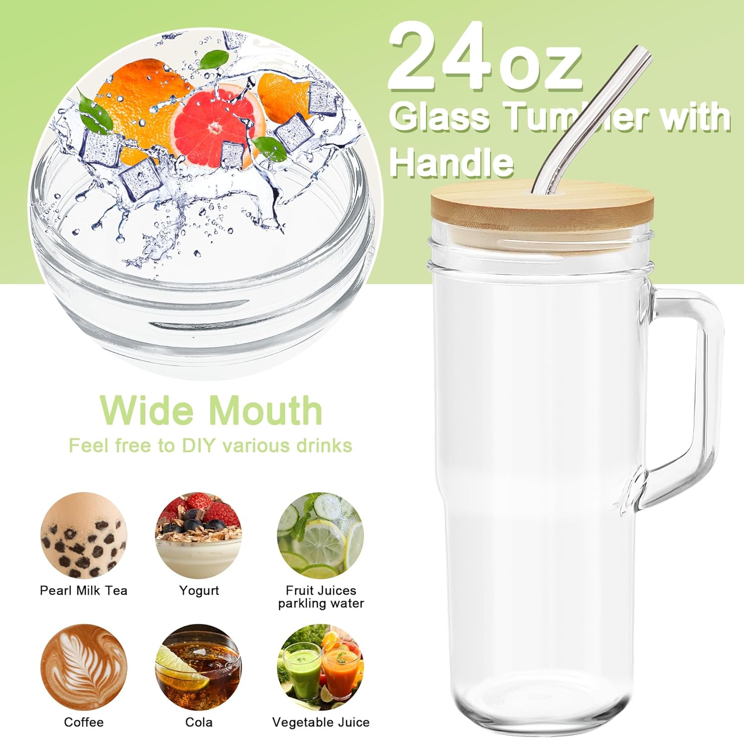 4-Pack 24oz Glass Tumbler Cups with Handle, Bamboo Lids, and Straws – Reusable Mason Jar Drinking Glasses for Iced Coffee, Smoothies, Beer, Juice, and Tea