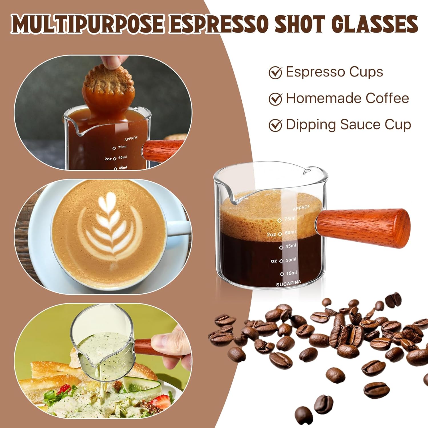 4 Pack Espresso Cups with Wood Handle, 75ml Double Spouts Measuring Triple Pitcher Milk Cup, Clear Espresso Shot Glasses Glass Milk Frothing Pitcher (3.5oz)