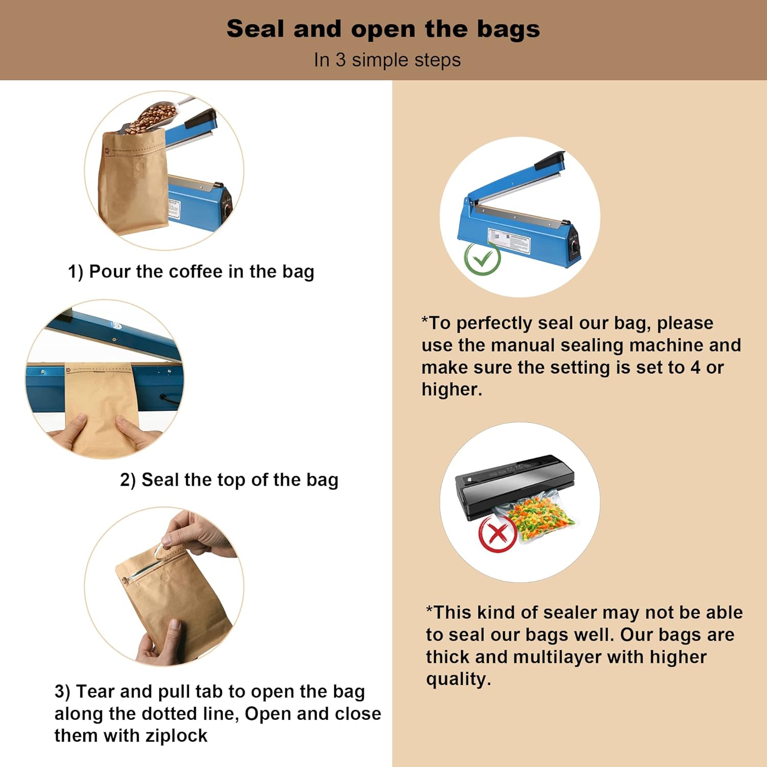 Easy Use Bags: Pull tape to open the bags and comes with resealble side zipper. Its sealed sides and flat bottom provide maximum strength, allowing the bag to perform as a true stand-up pouch. *** Important tips*** This type of bags must be sealed the top of bags by heat sealer(not included) after packing. Some type of sealers can’t seal our bags. Please see picture 7 for instruction.