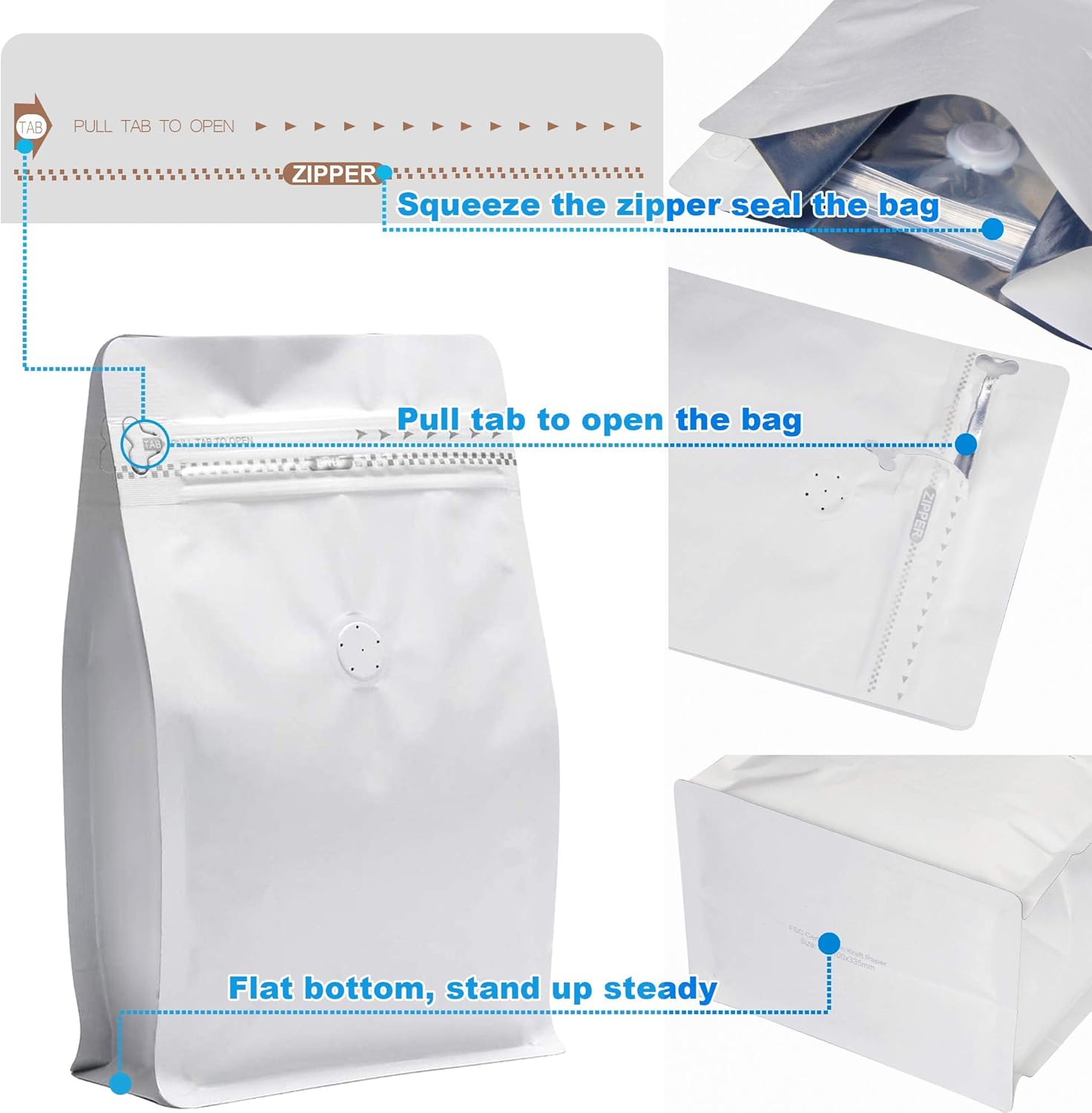 50 Pieces 12 Ounce White Kraft Paper Coffee Bags, Stand Up Coffee Pouches with One Way Degassing Valve and Reusable Side Zipper (Pull Tab to Open) Flat Bottom – Stand Up Well (12oz, 340gram)