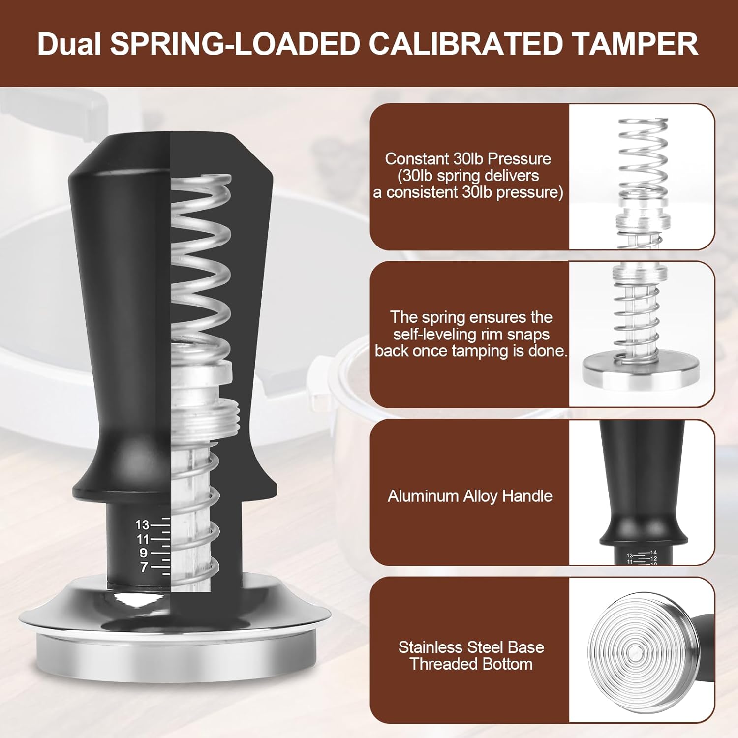 51mm Dual-Spring Tamper – This 51mm calibrated espresso tamper is crafted from stainless steel and aluminum. Equipped with dual springs, it ensures consistent tamping pressure of approximately 30lbs for every use, promoting even coffee extraction. The threaded base also aids in controlling water flow, ensuring uniform saturation of the coffee grounds.