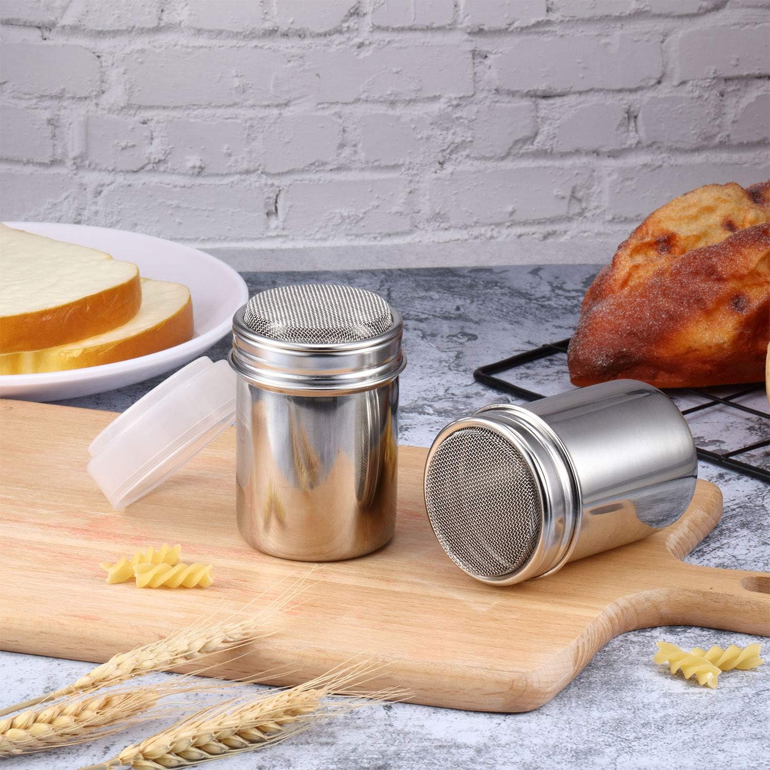 Coffee dusting cans: the dusting cans are made of stainless steel which are durable to serve you for long time, can make your work easier, and the ground coffee and sugar powder are more delicate