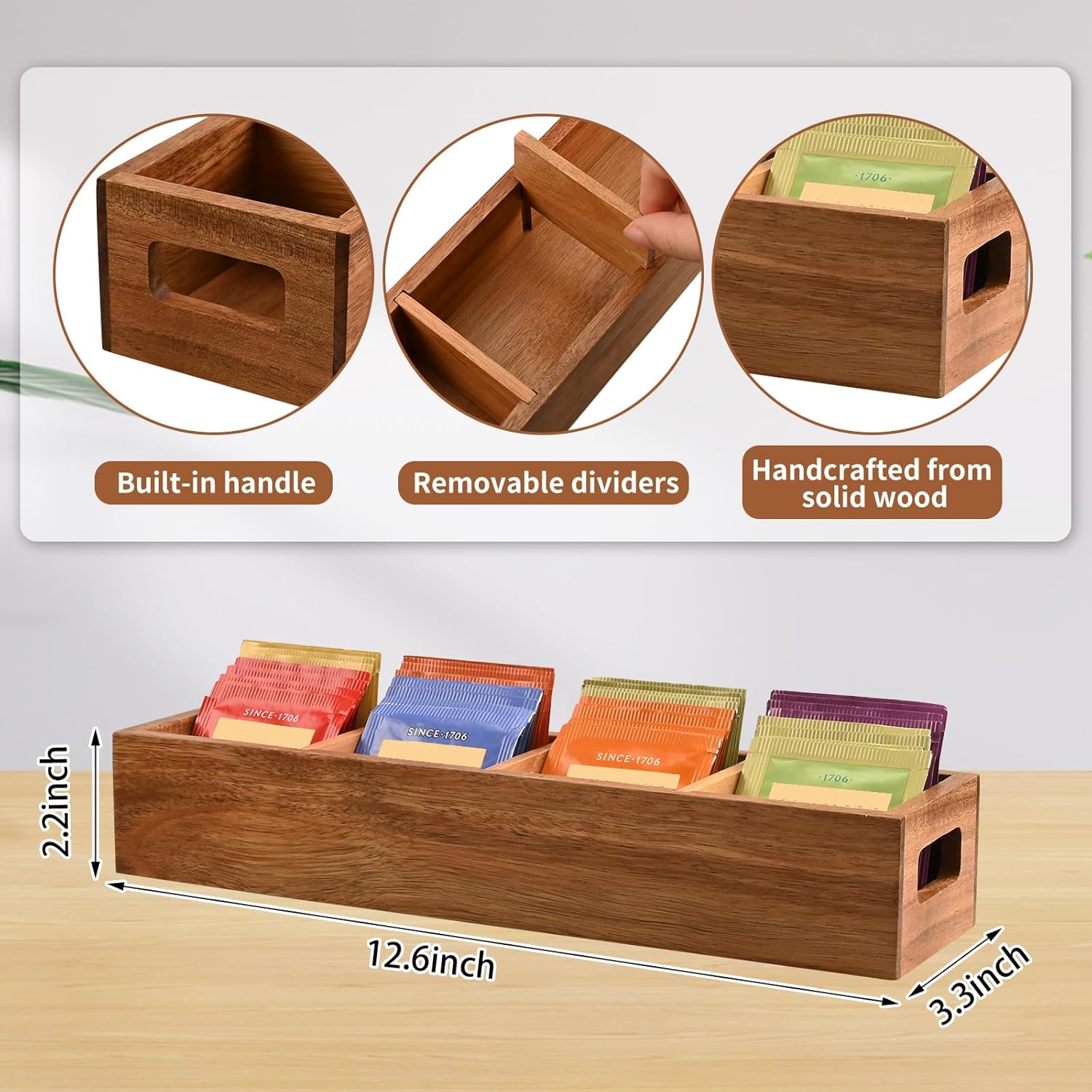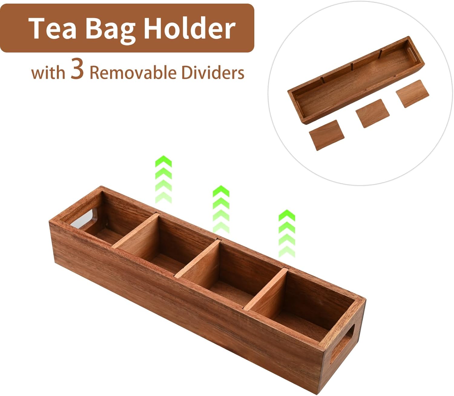 Acacia Wood Tea Bag Organizer with 4 Slots – Tea Bag Holder and Tea Organizer, Sugar Packet Storage for Countertops