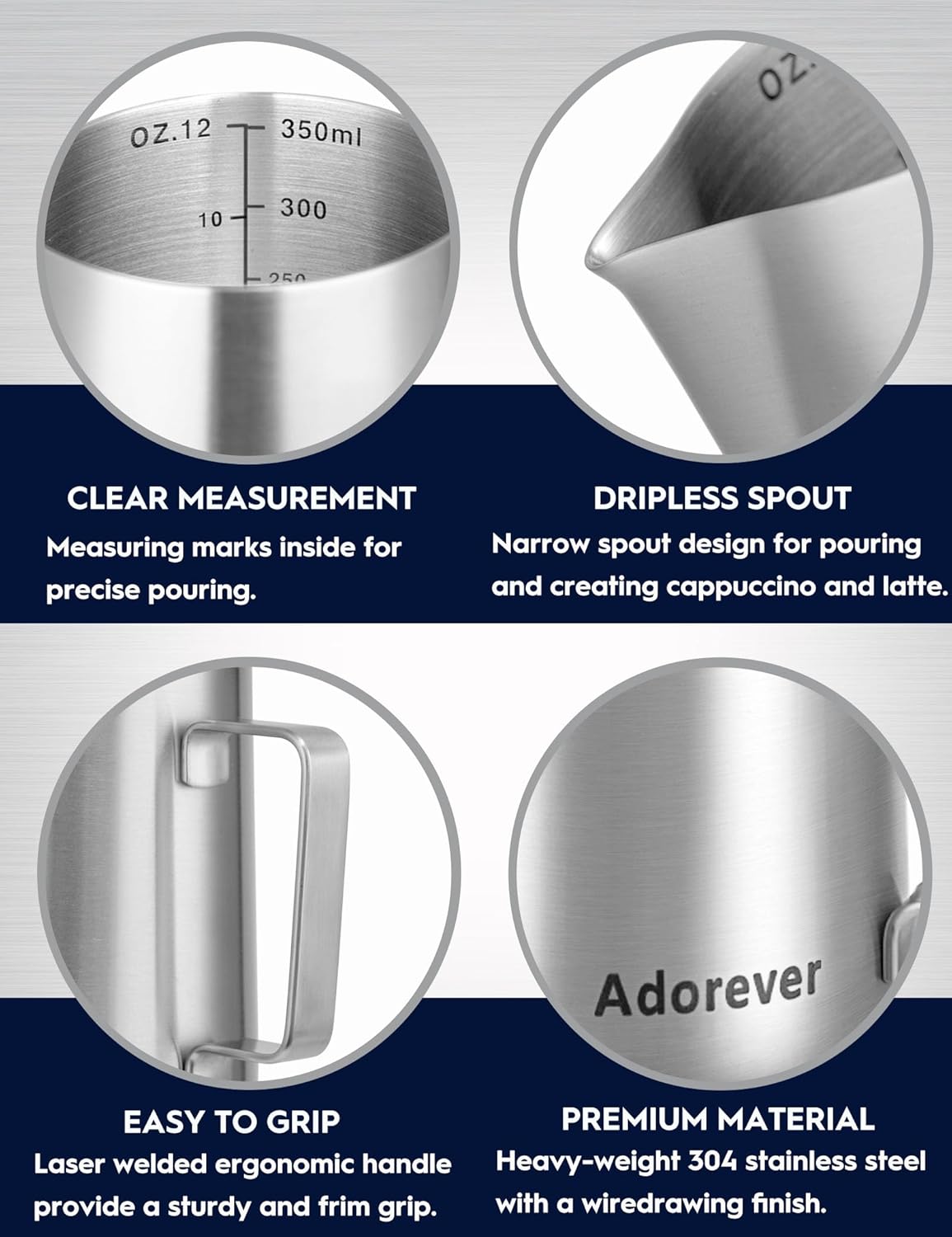 12oz 20oz 32oz Espresso Steaming Pitchers Stainless Steel Cappuccino Coffee Machine Accessories12oz 20oz 32oz Espresso Steaming Pitchers Stainless Steel Cappuccino Coffee Machine Accessories MATTE STEEL FINISH, TEXTURED AND PREMIUM ADOREVER 12/20/32 OZ STAINLESS STEEL MILK FROTHING PITCHER