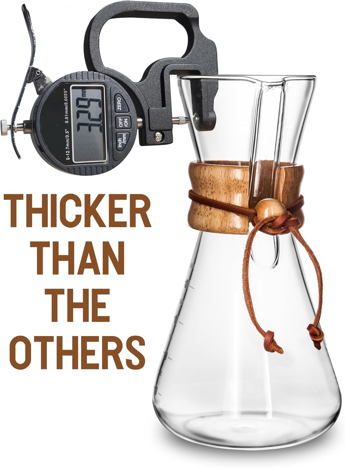 I’ve had a chrmex – until I accidentally smashed it and then cried bc I didn’t want to pay the high price for another until I found this. Similarities: The borosilicate glass is the same, the wood collar & tying ball, leather string are the same. The shape & thickness are nearly identical Differences,; the spout on this is more square-ush but goes the length of the spout into the bottom chamber like the chrmex. You can feel the line where the 2 halves of glass were sealed but you can’t discern this on a chrmex. The halfway glass nub on the chrmex is missing but theres silkscreened measurement marks on the side which are irrelevant since no one drinks a 5 ounce cup of coffee. This comes with a pretty nice metal filter, a brush & microfiber cloth chemex has none of these. Uses same expensive paper filters as chemex. So you see theres no major dif in form or function from a chemex and it makes the same great coffee AND it’s $22 cheaper (almost half the price) of an 8 cup chemex so unless you’re a rich purest snob get this one!