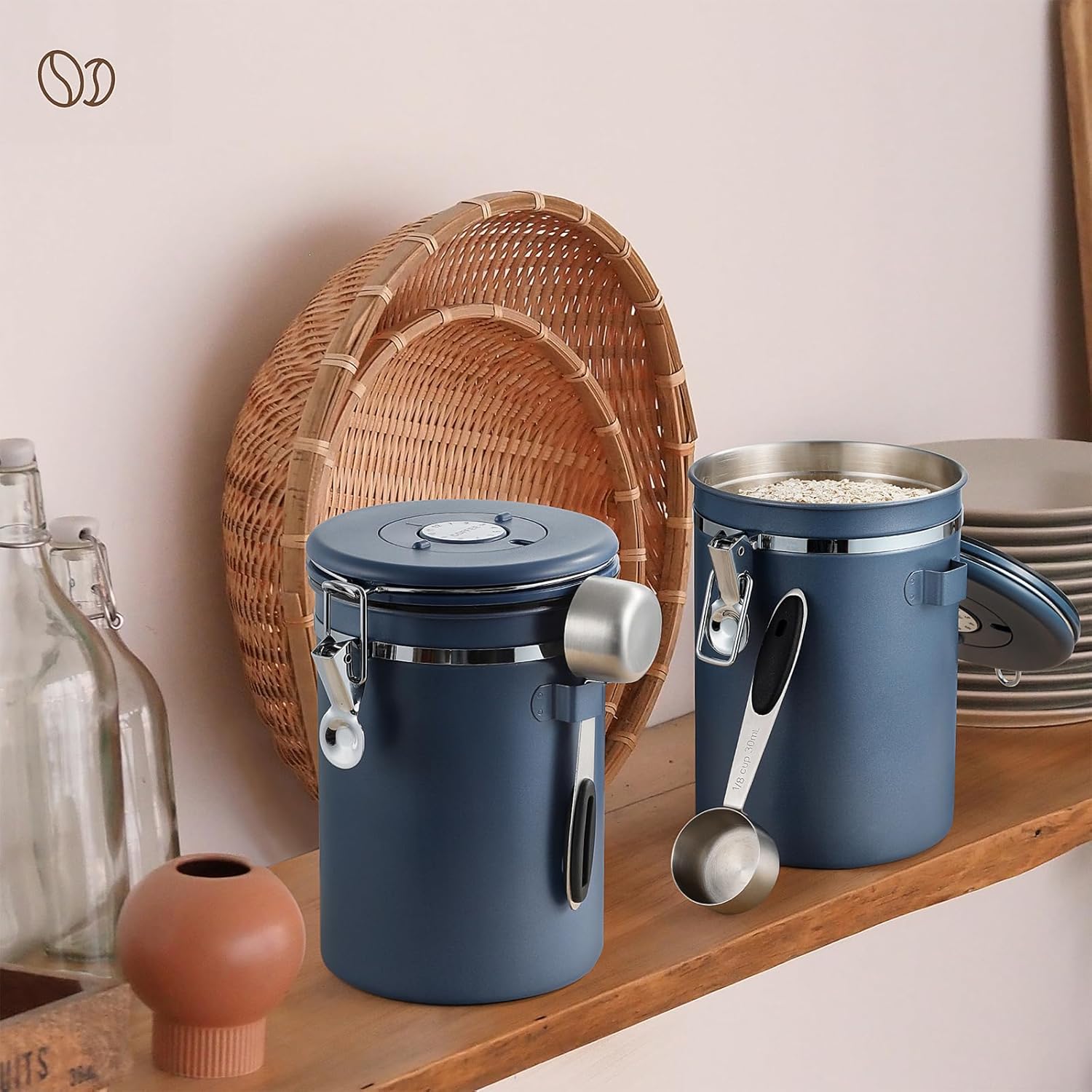 Airtight Coffee Canister 22OZ Stainless Steel with Date Tracker, Measuring Scoop, CO2 Releasing Valves, Kitchen Food Storage Contanier, 1800ml