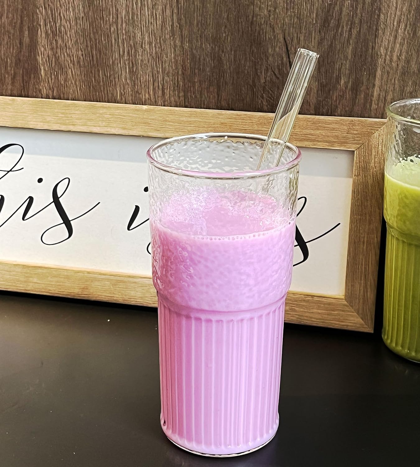 GLASS TUMBLER WITH STRAW AND LID & VERSATILE USES: This cute versatile cup design is perfect for a range of beverages, including iced coffe, juice, smoothie, bubble tea, soda, and milk. Plus, the cups are easy to clean and dishwasher safe, ensuring hassle-free maintenance