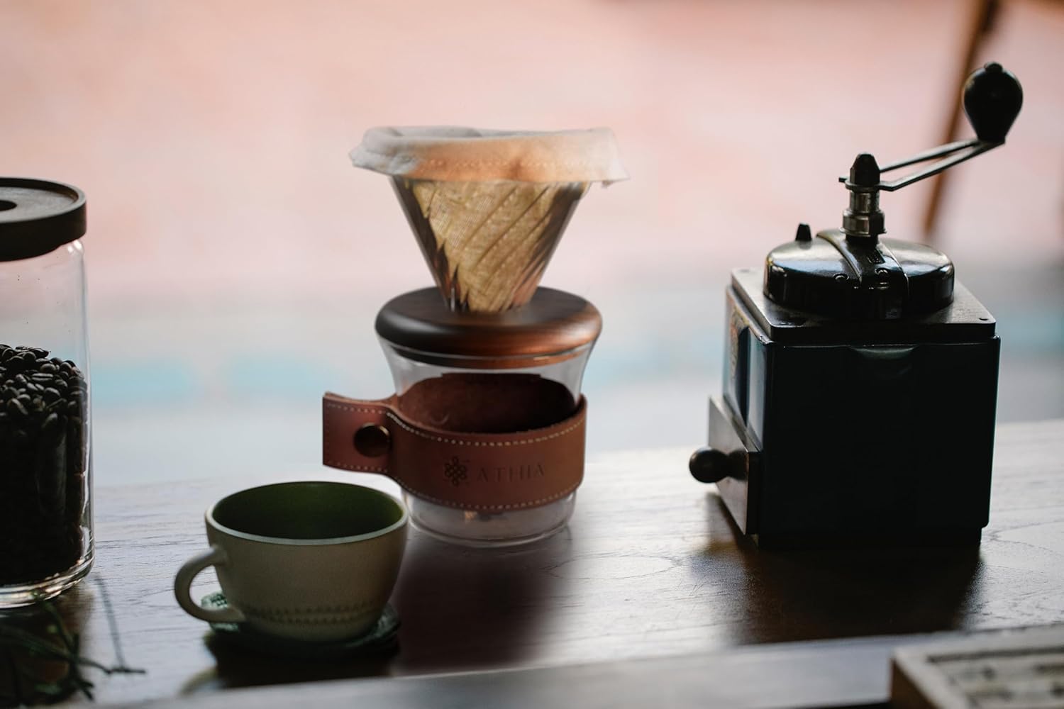 ATHIA Glass Pour Over Coffee Dripper Set, Glass Cone Dripper, Reusable Cloth Filter, Leather Cup Sleeve, Minimal Single Cup SET, for outdoor, office or at home (Walnut Wood)