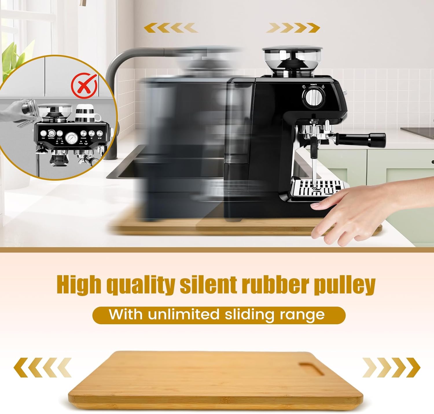 The ultimate in space saving and convenience for your kitchen. Rolling back and forth quickly and quietly, you can easily pull the coffee pot or fryer out from under the cabinet and organize your kitchen worktop with ease. Size 13. 8*9. 5 inches This countertop coffee pot sliding tray can accommodate larger coffee or espresso pots, as well as small air fryers and kitchen blenders. Made of high quality bamboo for an elegant look, it is sturdy, waterproof and easy to clean without damaging your worktop. With this important appliance accessory, you can save energy and enjoy a tidy kitchen.