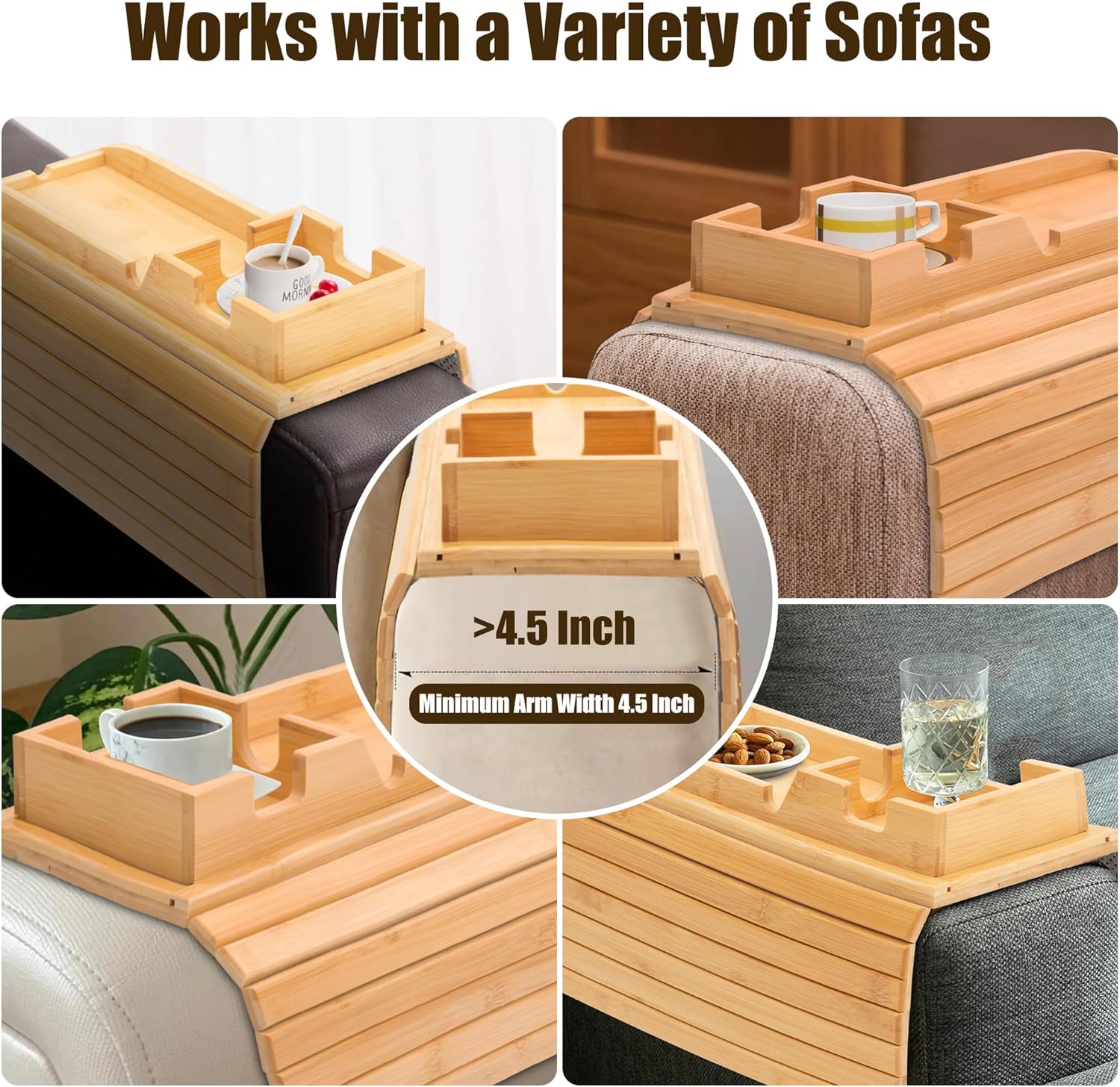 【Easy to Use and Clean】Our cup holder for couch is easy to use and does not require any assembly. And the natural bamboo sufface is very easy to clean with a damp cloth. With the foldable design, the couch arm tray can be easily put away in a drawer or under the couch when not in use, taking up less space and saving storage space.