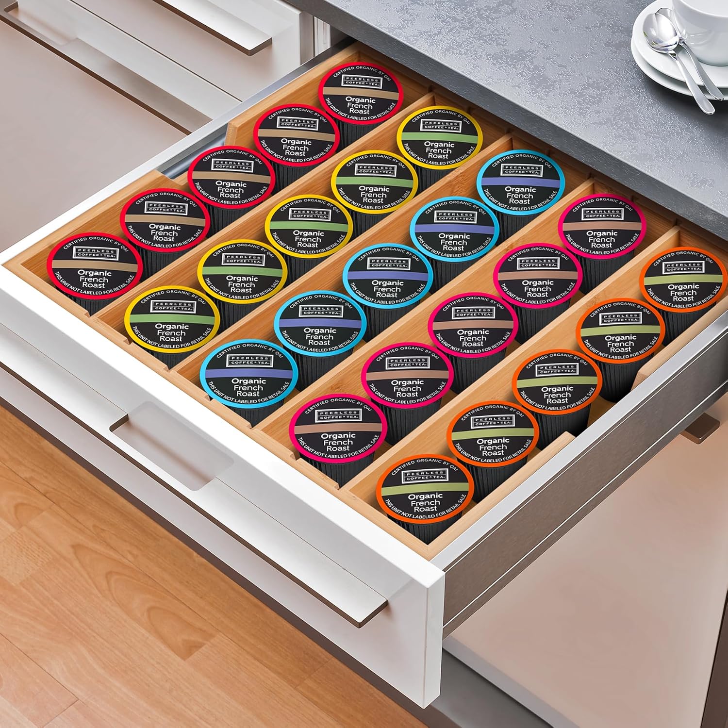 This drawer organizer can be used with coffee pods, tea packets, kitchen utensils, or a variety of other uses. With the adjustable dividers, you’re given the flexibility to rearrange the compartments to your needs. As a matter of personal preference, I do appreciate the the product is made of wood/bamboo rather than plastics.In my case, I’ve chosen to organize and display the various coffee pods so that they’re easily accessible when the desire for caffeine arises! It’s a quality of life improvement that I gladly welcome over having pods stored in various packaging/jars.If you’re looking to add some organization to your drawers, I would recommend this product for your consideration. Also, it could make for a nice gift for anyone who’s recently acquired a new coffee machine or recently moved into a new home/apartment!