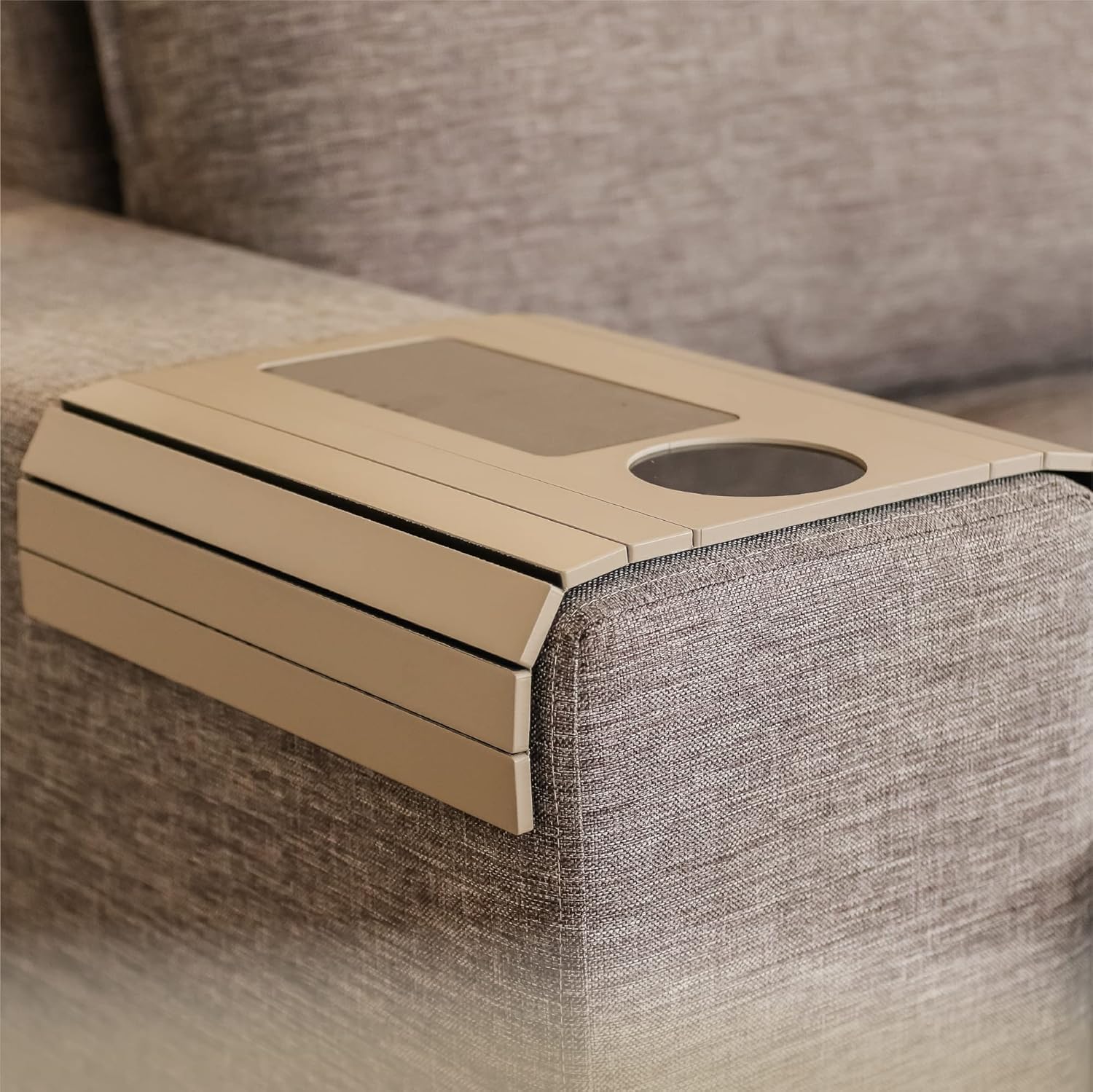 Perfect fit for any couch. The flexible bamboo wood slats and non-slip backing ensure it stays steady on any armrest, even angled ones. Stylish and practical, with dedicated secure slots for mugs, drinks, and a special phone holder for easy movie-watching. The removable top adds versatility for writing or larger items.â¤ï¸ loved the designâhighly recommend for both function and style ð