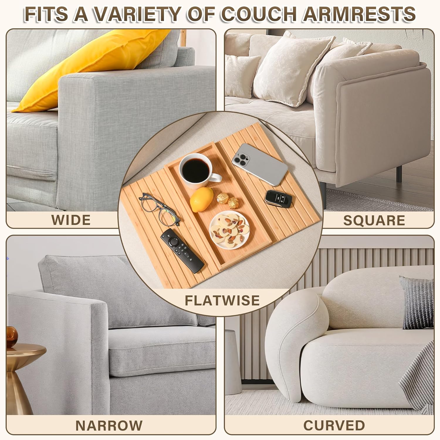 SOFA ORGANIZER LARGE TRAY: Simplify your living room setting with our bamboo sofa arm tray and maximize your comfort. The spacious 12.4 x 5.5 inches large tray can accommodate everything you need to relax and is within reach, such as mugs, coffee, beverages, snacks, remote controls, phones, keys, glasses, etc.