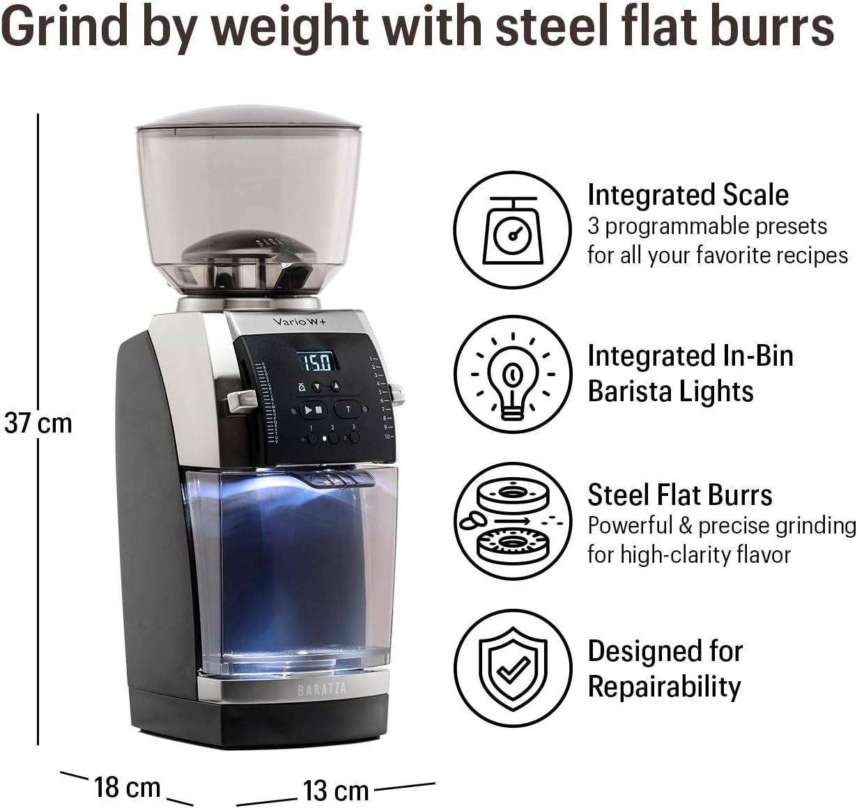 I bought this grinder to replace my previous grinder which was a 10+ year old Vario W. The “+” model is a significant improvement over its predecessor.1. The burrs are steel instead of ceramic – this produces better coarse grinds.2. The plastic knobs have been replaced with metal ones. The old plastic ones tended to break a lot.3. The control panel has higher quality buttons and the display is backlit and much easier to read.4. There is a light in grinds bin so you can see the coffee come out. Seems unnecessary but I really like this feature.5. It doesn’t seem to clog up like the Vario did from time to time.The “W” version of the Vario has a digital scale under the grinds bin so you can grind by weight instead of by time. This is essential if you want to produce consistent results day after day and is worth the upgrade IMO.One thing I like about Baratza products over the competition is that they make reasonably priced replacement parts available through their website. That means in a few years if something breaks, you’ll be able to fix it yourself rather than having to junk the whole grinder.This grinder is mostly targeted to people like myself who use French press, Chemex and the like. It produces very consistent coarse grinds. If your interest is primarily espresso, there may be better options for fine grinds.