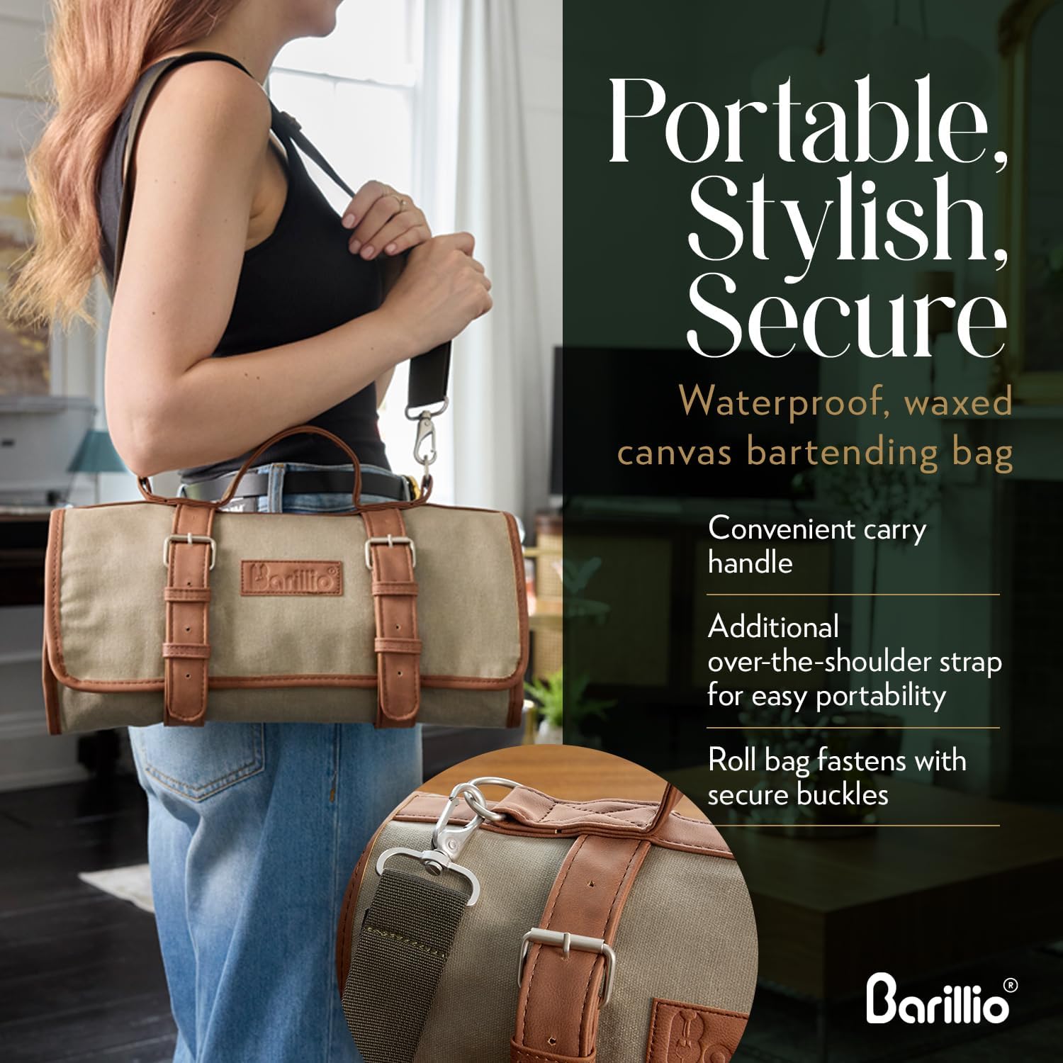 PORTABLE BAR BAG: Enjoy cocktails on the go with the Barillio travel bartender bag. Crafted from a durable waxed canvas, this portable, stylish roll up bag has compartments for your essentials.