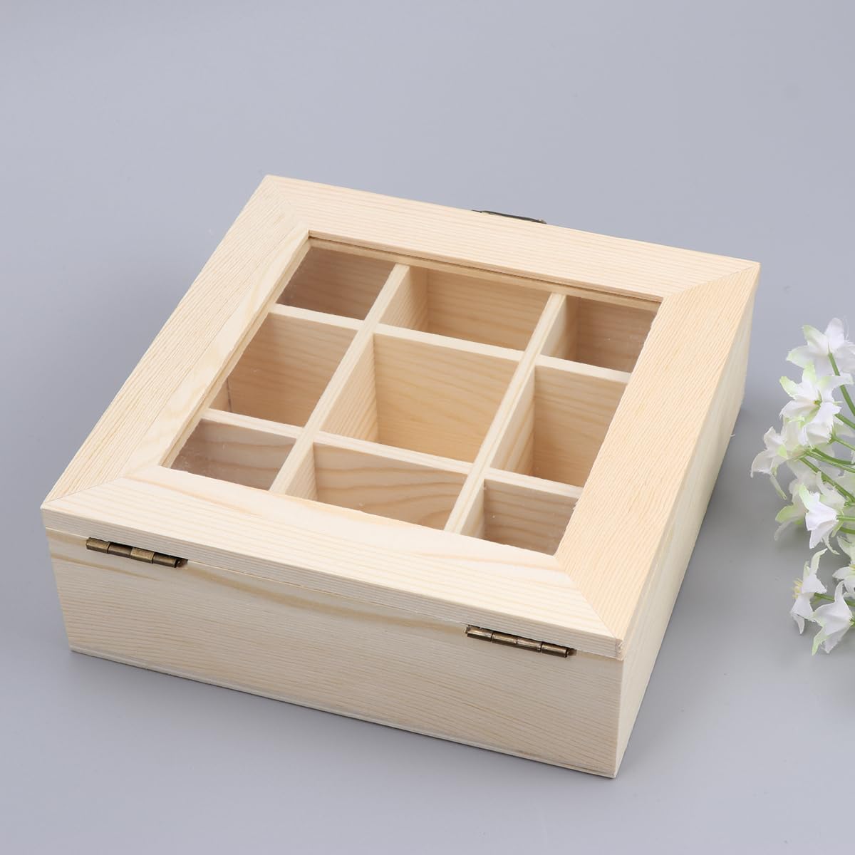 Beavorty 1Pcs Wood Tea Box Storage Organizer Rustic Tea Bag Holder Rack Coffee Storage Box Organizer with 9- Compartment and Glass Window for Coffee Tea Sugar Sweeteners Creamers