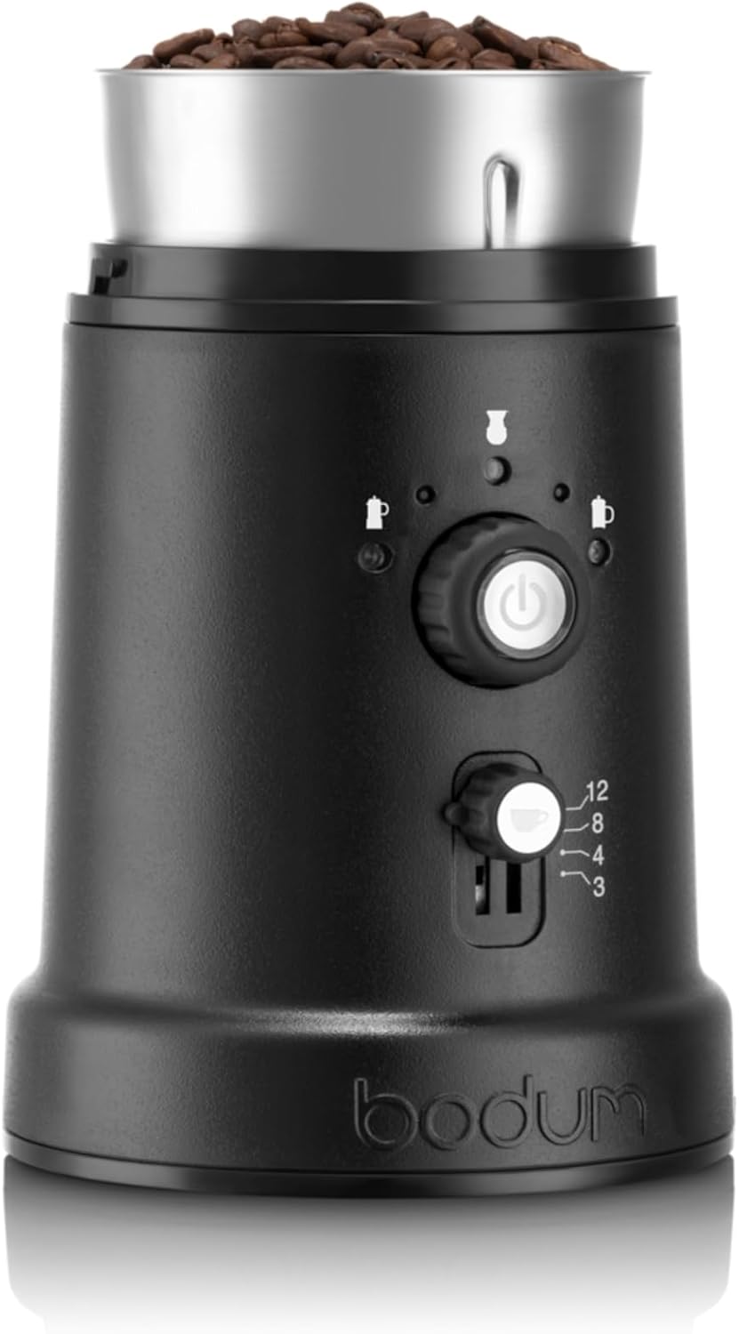Bodum Bistro Electric Coffee Grinder.This grinder is nicer than I expected! It is much nicer than my previous one it replaced. It looks nicer and more high end and functions much better although it is more expensive.Likes:Compact size.Smooth powerful grinder motion.I like that the stainless steel container is tall and is mostly stainless steel (my previous one was only stainless still on the bottom third of the container).The blade appears durable and made of thick stainless steel.I like the 5 grind setting options including coarse, medium, fine and in-between options for my various coffee needs – espresso maker, coffee maker, cold brew, hand drip coffee, etc.4 cup settings to ensure all beans are ground.Modern simple sleek design.Like the high end look. Non-slip rubbery matte lining on the exterior of the base helps with safely moving the grinder around and makes it look more high end. There is also non-slip ribbed lining the control knobs which makes it easier to turn and looks nice as well.Stable with non-slip lining on bottom.User-friendly with turn dials and power control button.Bright and clear indicator lights.Other features: Twist lid to open and close/lock chamber. Transparent lid.Overall, nice looking grinder that cover my basic home coffee making needs.