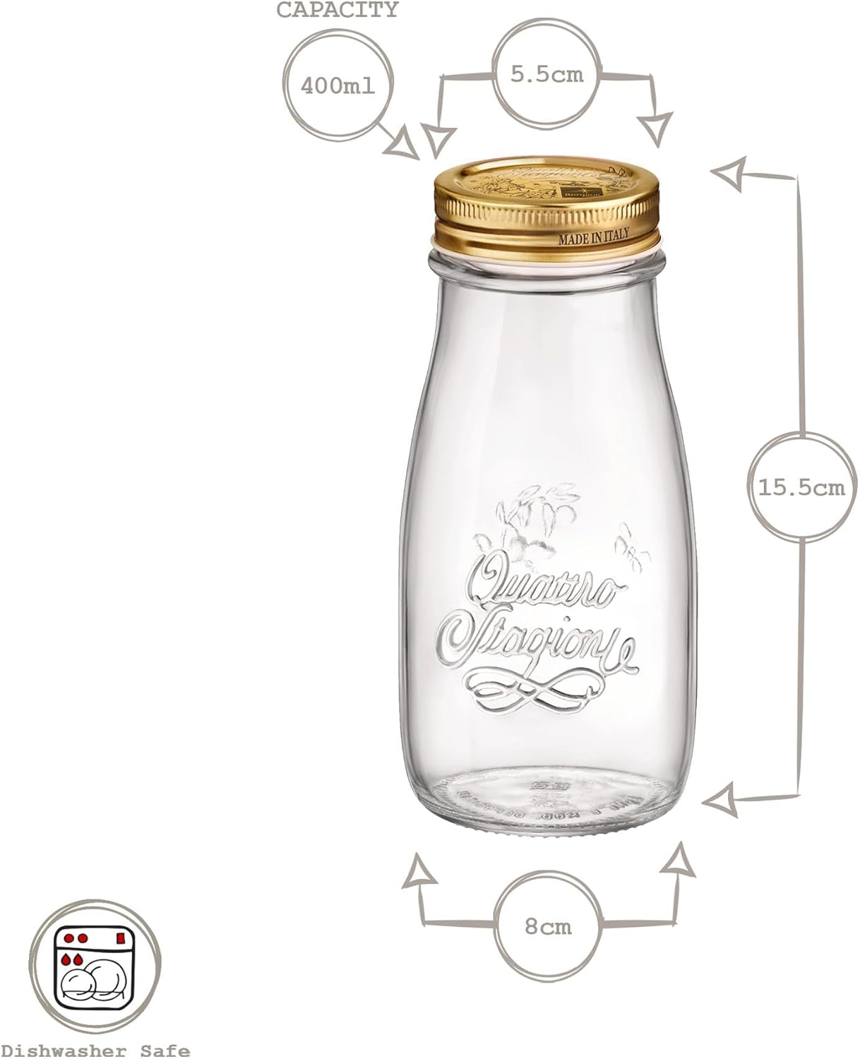 Bormioli Rocco Quattro Stagioni, Glass Canning Jar and Drinking Bottle, 13.5 Oz. with Gold Metal Airtight Lid, Made in Italy.