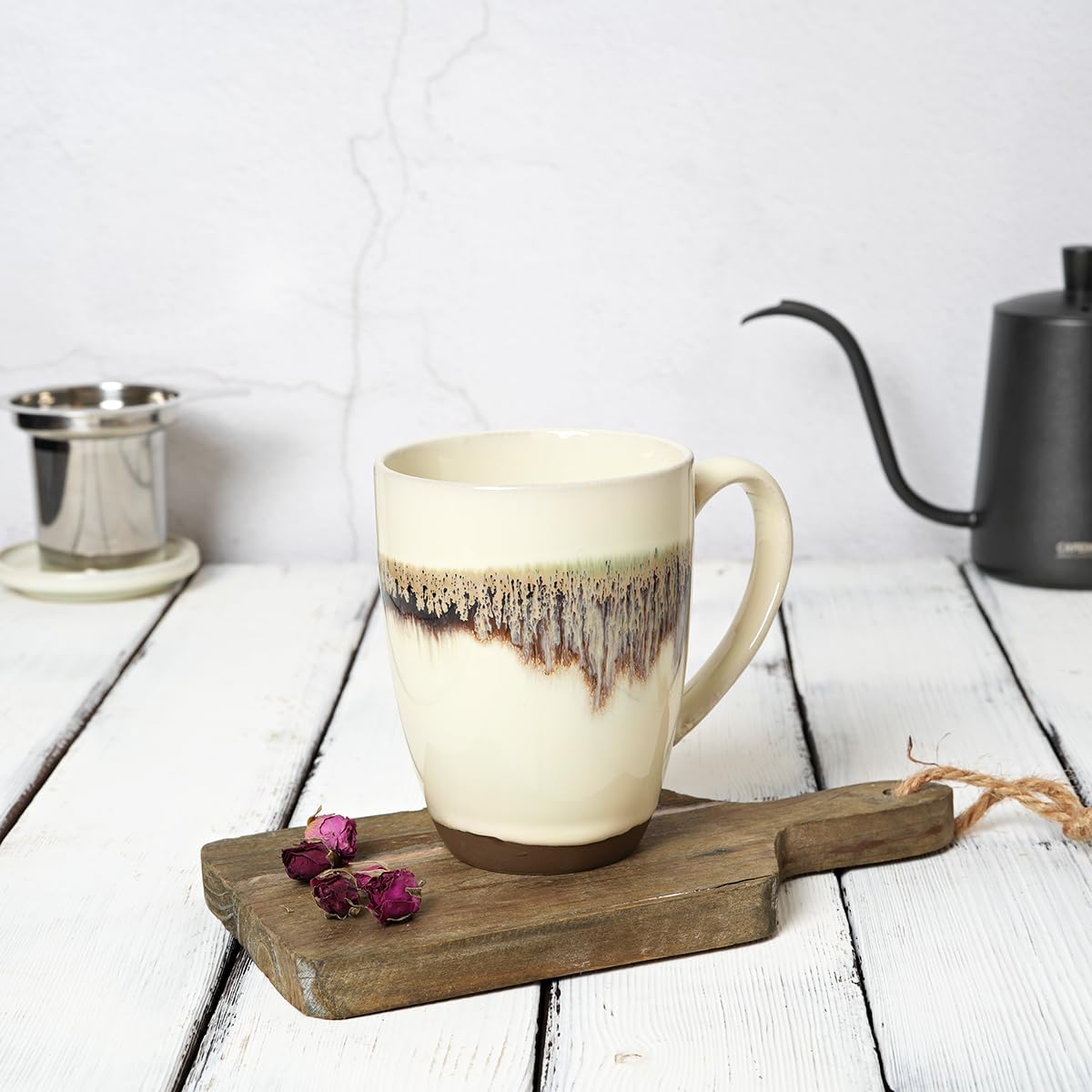 A perfect cup for a perfect cup of hot tea. I love the earth colors of beige and brown. The spacious handlegives you a good grip even with a full cup without burning your fingers. It is just a very nice tea mug. I love it!