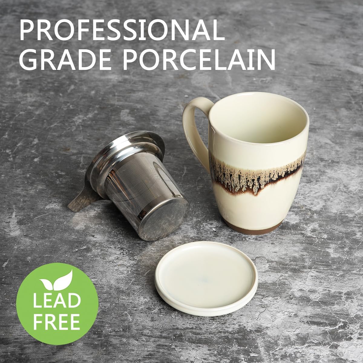 Beautiful mug I love the tea filter and the cover to keep my tea warm. Very nice and well made. Lead-free, microwave and dishwasher safe.