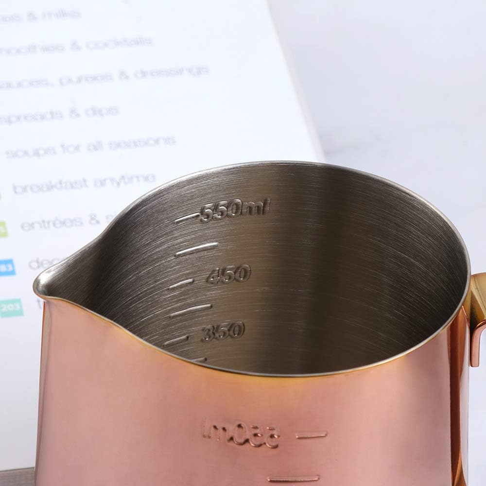 Buyer Star Milk Frothing Pitcher(20oz) Steaming Pitchers Stainless Steel Milk Coffee Cappuccino Latte Art Barista Steam Pitchers Milk Jug Cup Measurement Scales with Decorating Pen(ROSE GOLD, 550ML)