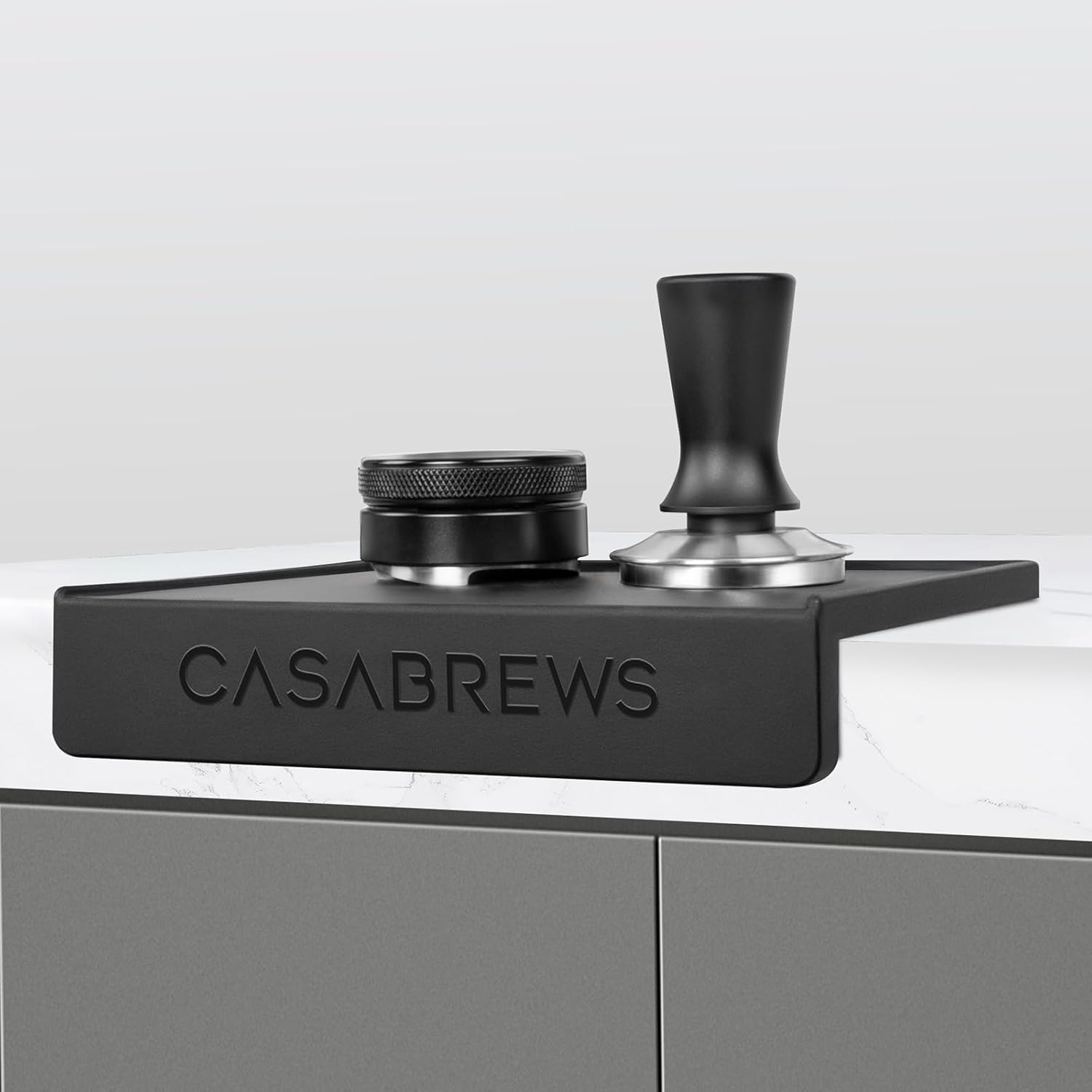 Casabrew makes great espresso machine and accessories. This tamping matt is no exception. The 6×8 matt is heavy as it is over 1# in weight. Plop it on the edge of the counter and the rubber will not stip. The L shaped wrapped edge prevents the tip of a standard portafilter from marking up or chipping counter tops. The raised lip around the top edge of the matt prevents a coffee brush or WDT from rolling offThe matt is a perfect size to hold various espresso accessories from distributor, tamper, wire distribution tool, portafilter and screen. Everything can be laid out to funnel, distribute and tamp for any standard or bottomless portafilter in hand.This matt does not have any recesses for accessories or single place for a portafilter. I prefer the matt to be just a single smooth surface so no coffee power gets trapped and difficult to clean out.Another excellent Casabrew product.