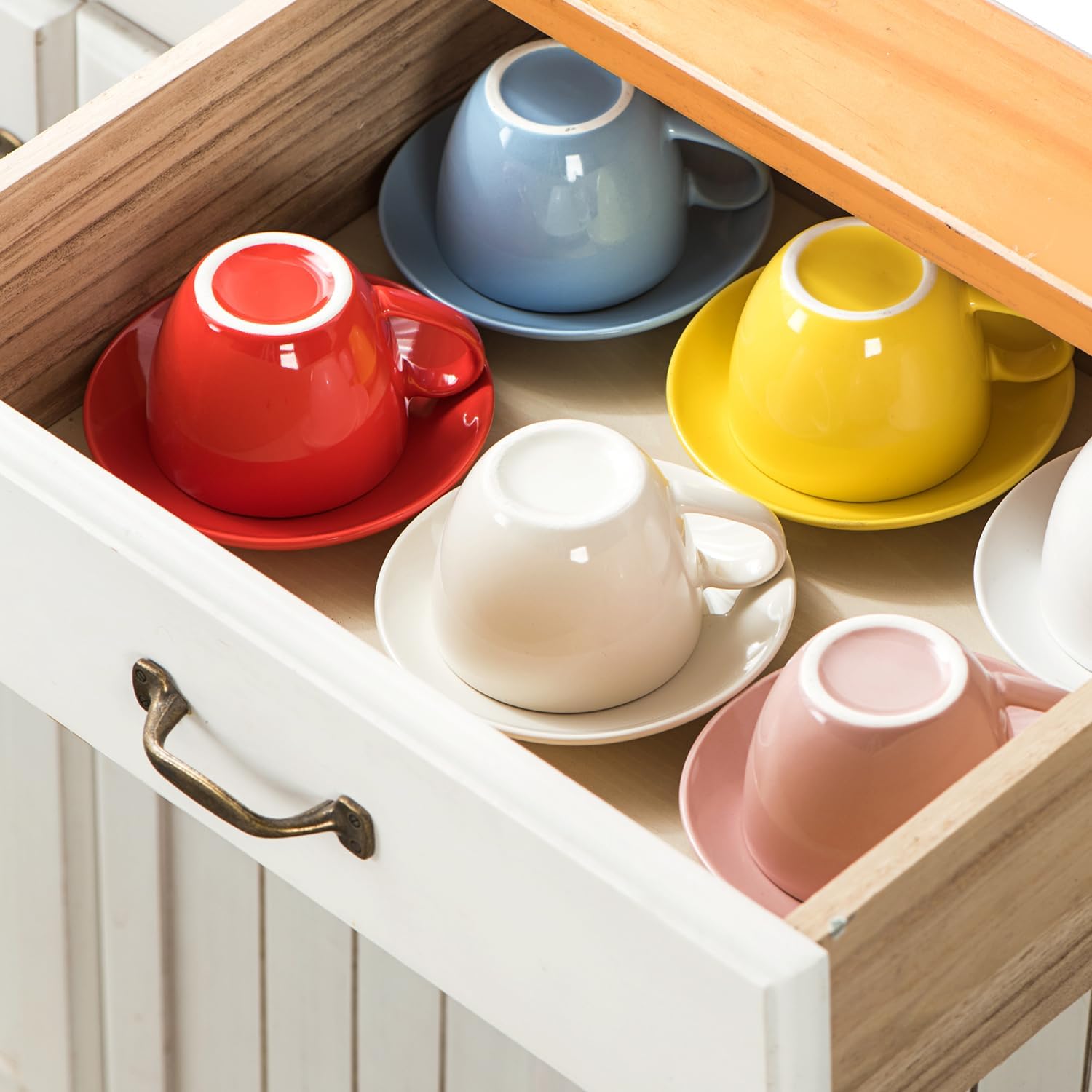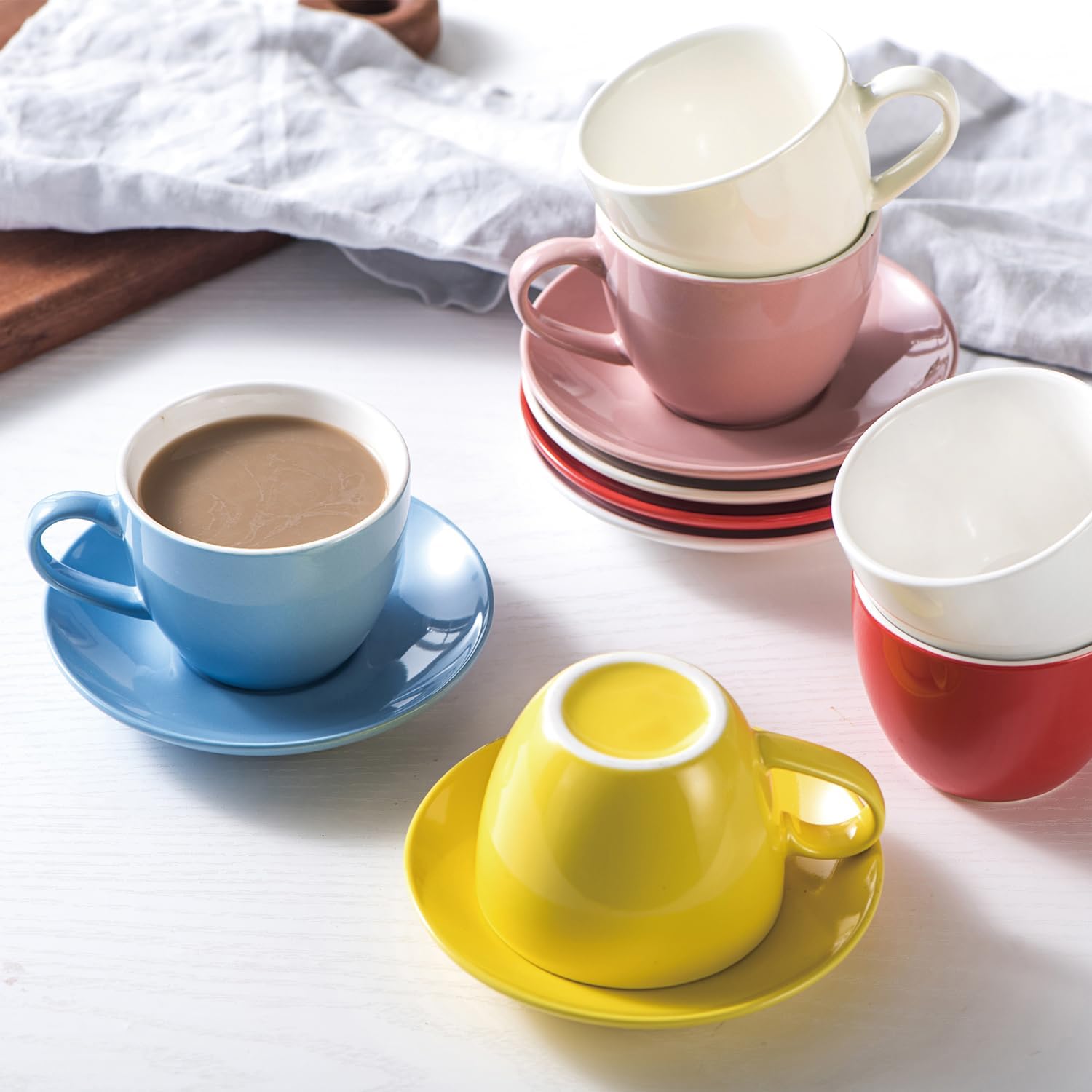 ☕ STYLISH AND BRIGHT 6 COLORS: This cappuccino cup and saucer set offers a selection of 6 captivating colors. The sleek and glossy surface adds a personalized touch to your coffee moments. Its thoughtfully designed shape allows for easy stacking and storage in cabinets or on shelves.