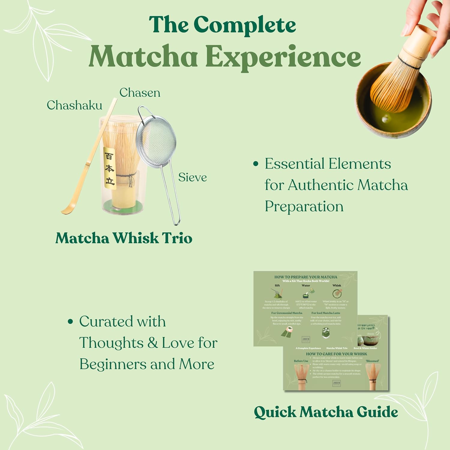Guided Matcha Experience: A “How-to” card is included with easy-to-follow instructions, guiding you through the matcha preparation process and helping you create an authentic matcha ceremony at home.