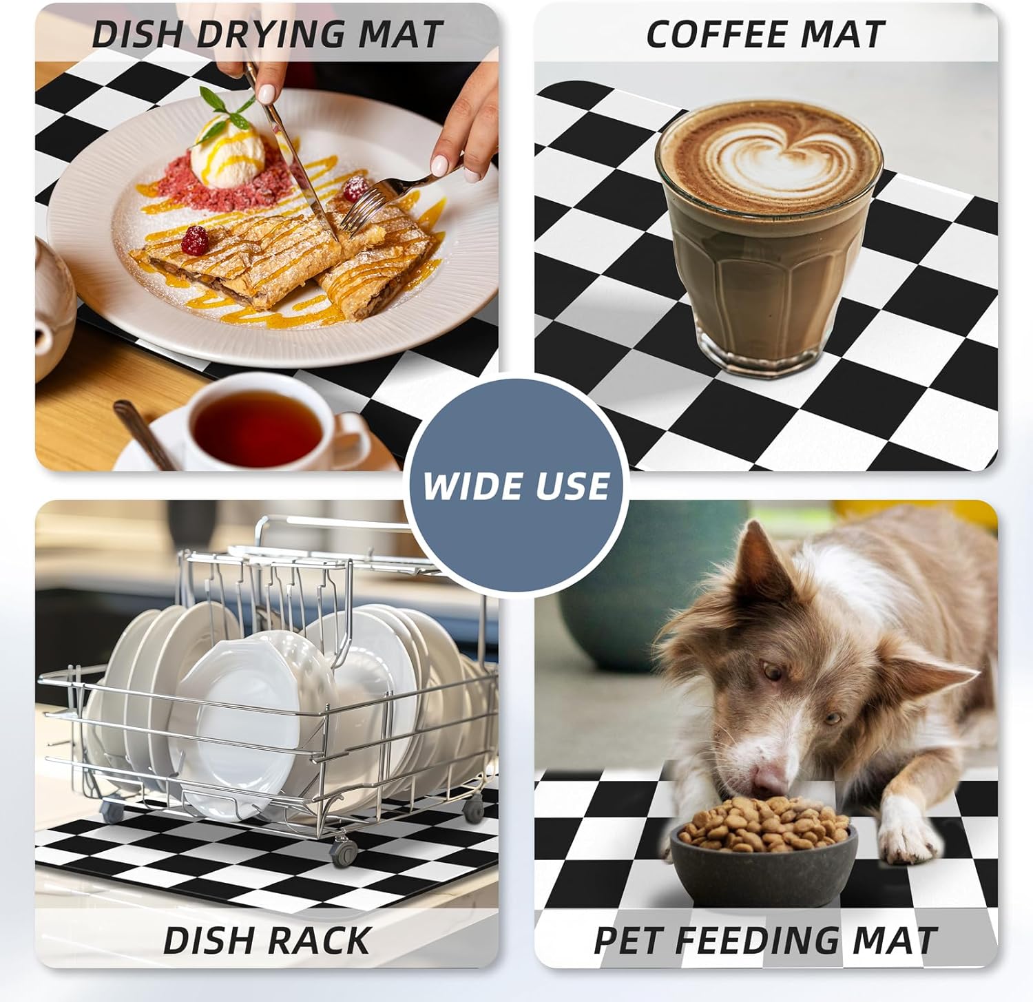 Checkered Coffee Bar Mat and Dish Drying Pad,Quilting Absorbent Easy to Clean, Non-Slip Rubber Backed, 12″x19″ Black White Pro